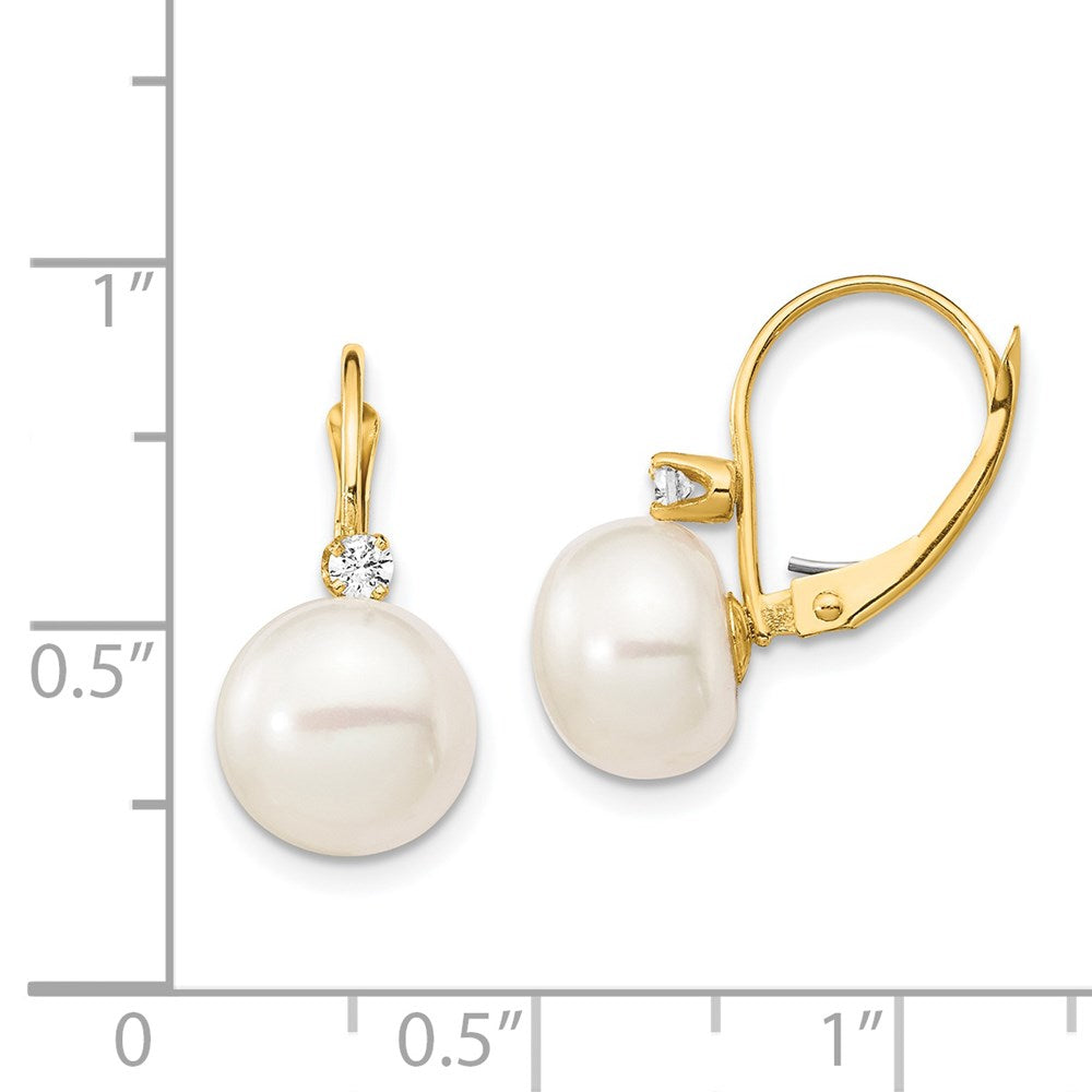 14k 10- White Button Freshwater Cultured Pearl and .10 Carat Diamond Leverback Earrings