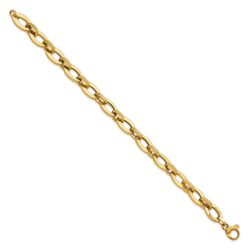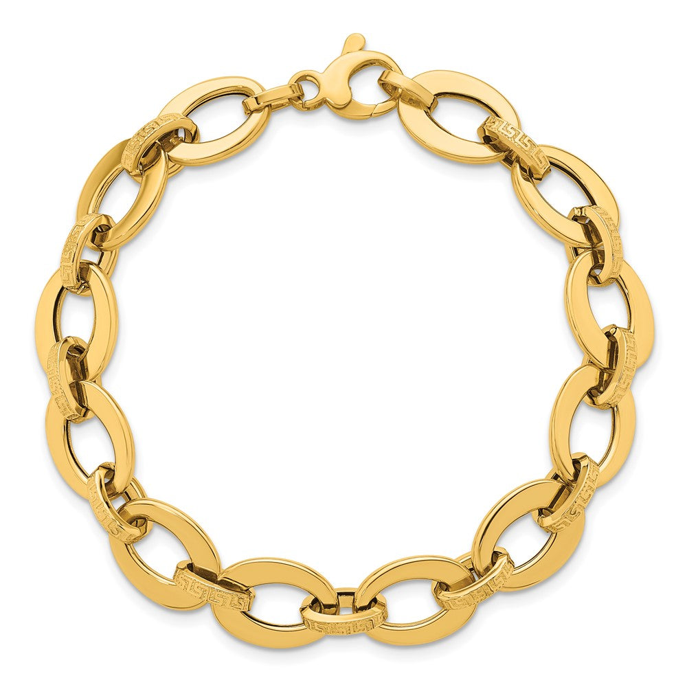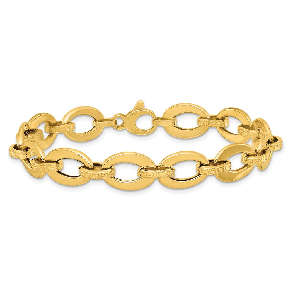14K Polished and Textured Greek Key Etched Fancy Oval Link 7. Bracelet