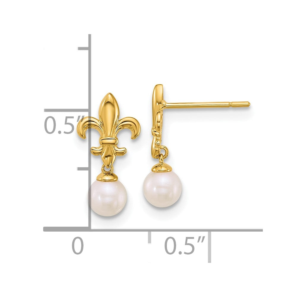 14k Polished Fleur de Lis 3- Freshwater Cultured Pearl Post Dangle Earrings