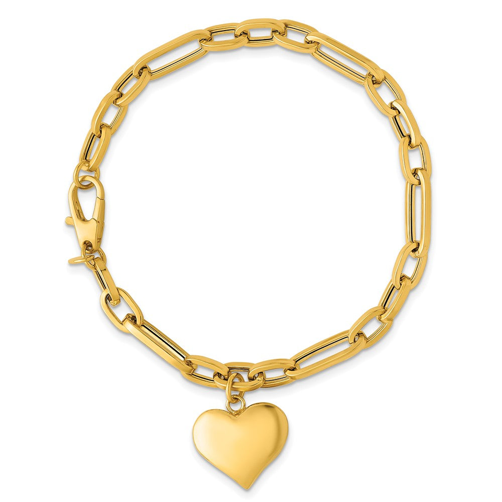 14k Polished Paperclip Figaro Link With Puffed Heart Dangle 7. Bracelet