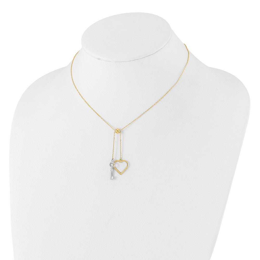 14K Two-tone Polished Adjustable-Dangle Heart and Key Lariat Necklace
