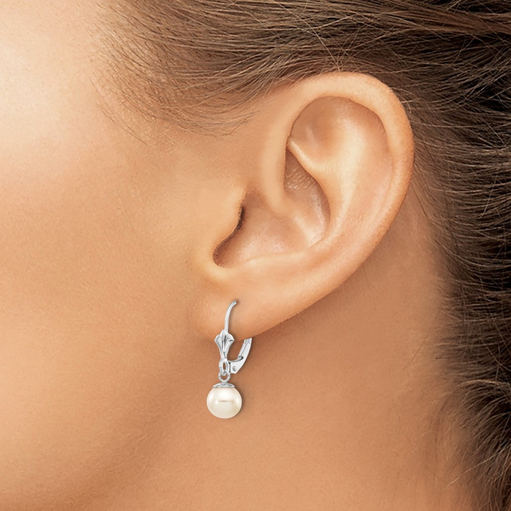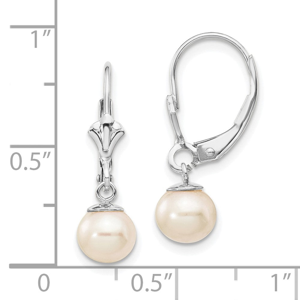 14k White Gold 6- White Round Freshwater Cultured Pearl Dangle Leverback Earrings
