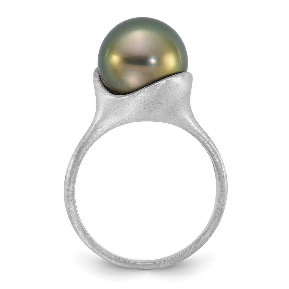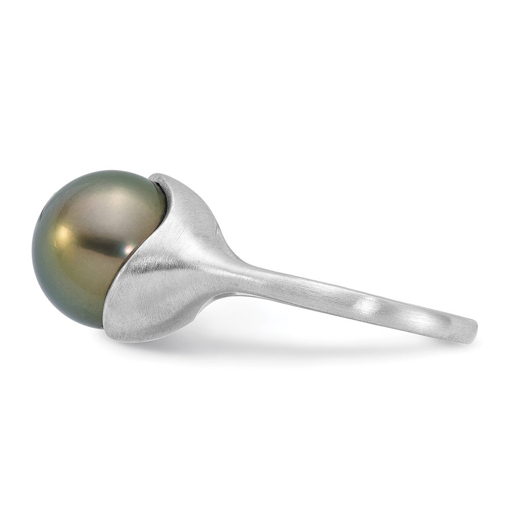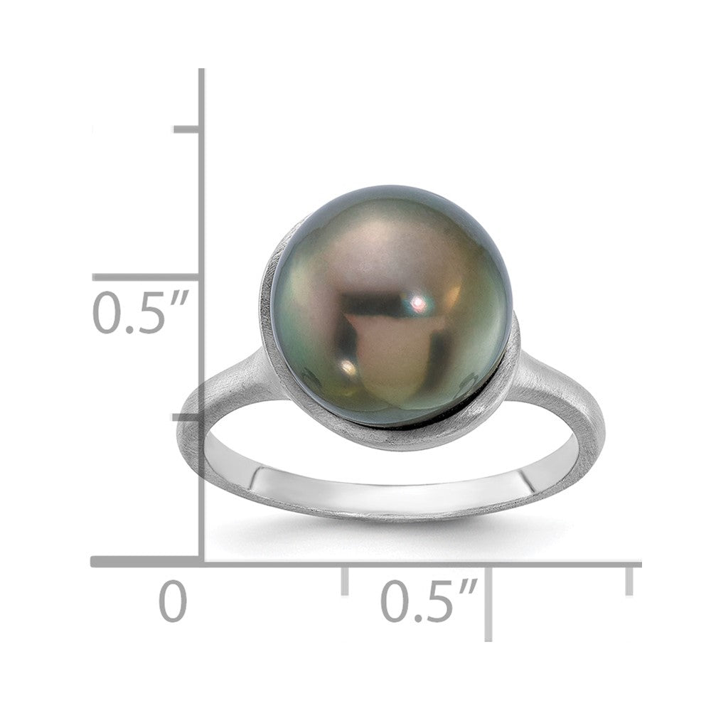 14k White Gold Brushed 10- Round Black Tahitian Saltwater Cultured Pearl Ring