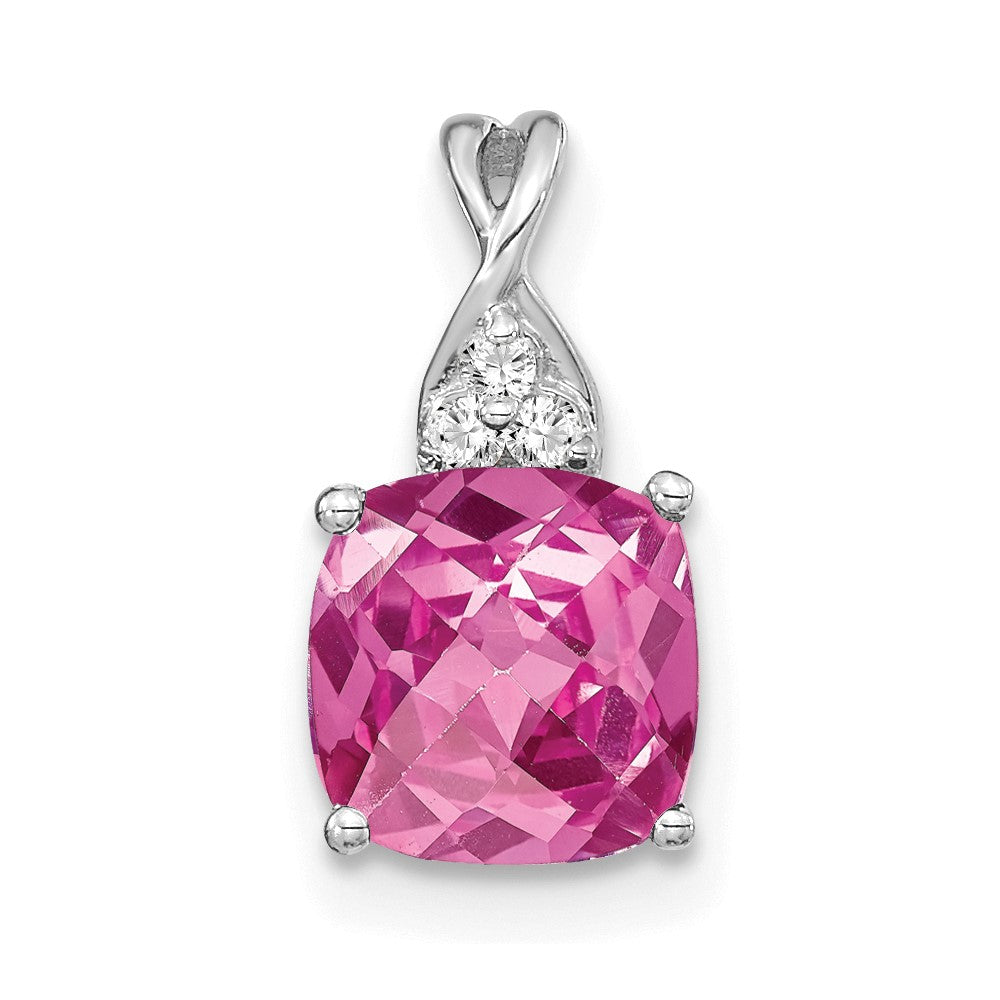 14K White Gold Checkerboard Created Pink Sapphire and Diamond Pendant