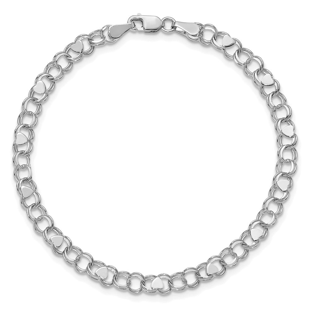 14k White Gold Solid Double Link with Hearts Charm Bracelet