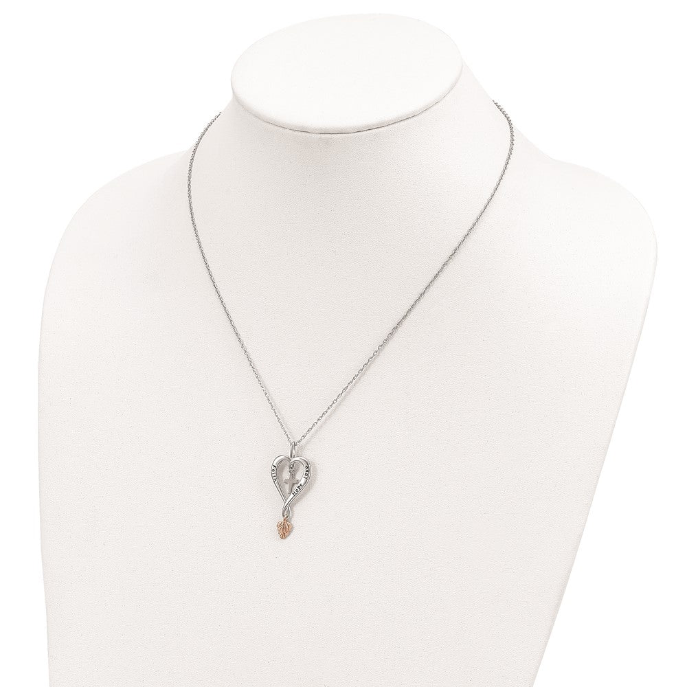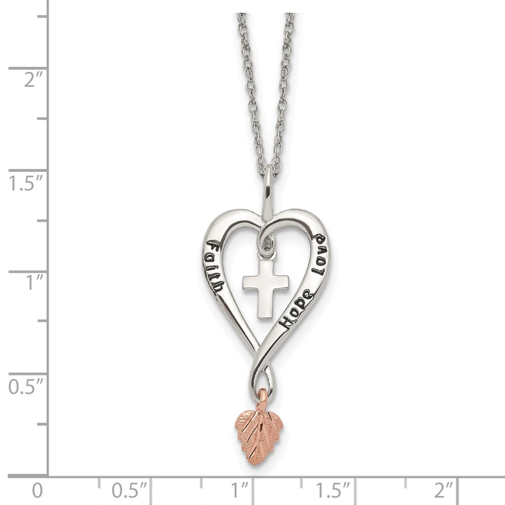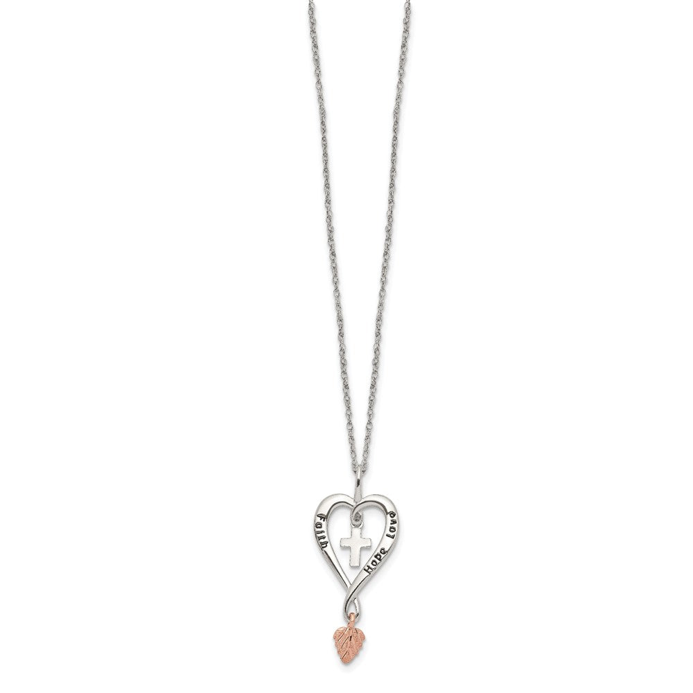 Landstrom's Mt. Rushmore Black Hills Sterling Silver 12K Gold Accents Antiqued FAITH HOPE LOVE Heart with Cross and Leaf Dangle Spring Ring Clasp Necklace