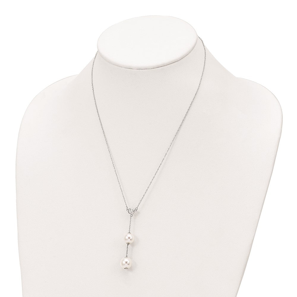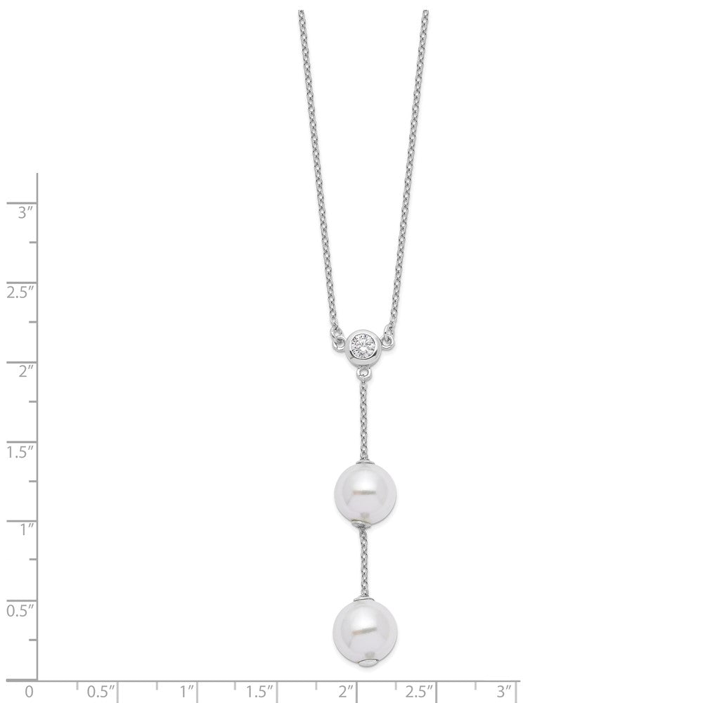 Majestic Sterling Silver Rhodium-plated 10- White Imitation Shell Pearl CZ Y-Drop Spring Ring Clasp Necklace
