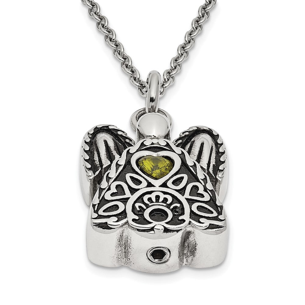Sentimental Expressions Stainless Steel Light Green CZ August Birthstone Antiqued Angel Ash Holder Necklace