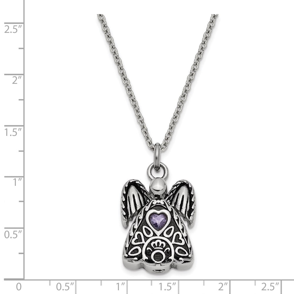 Sentimental Expressions Stainless Steel Purple CZ February Birthstone Antiqued Angel Ash Holder Necklace