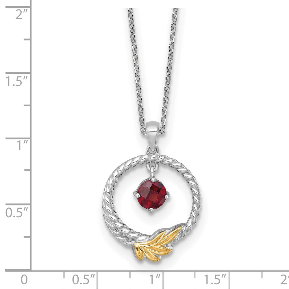 Shey Couture Sterling Silver Rhodium-plated Twisted Circle with 14k Leaf Accent Round Garnet Dangle with Extension Necklace