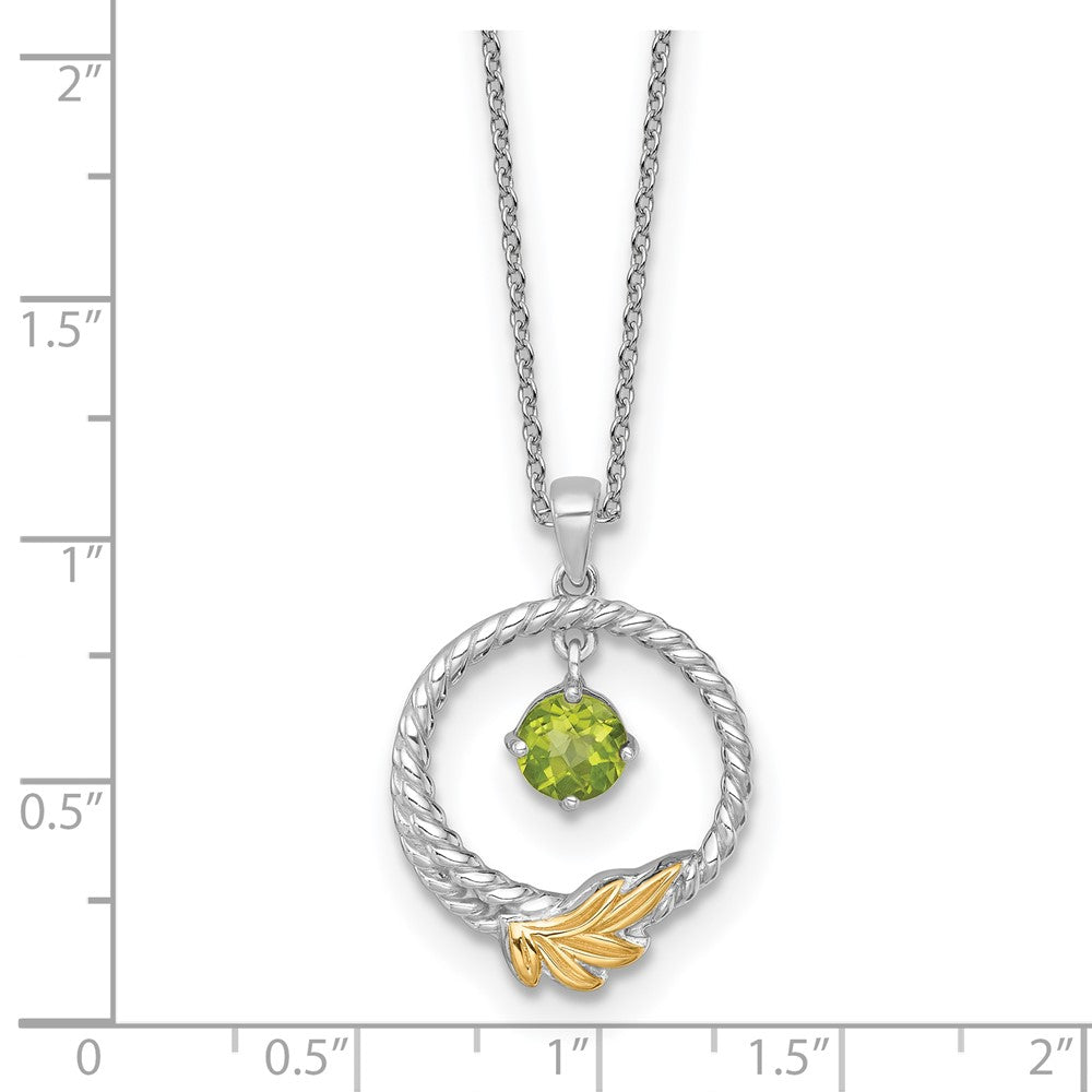 Shey Couture Sterling Silver Rhodium-plated Twisted Circle with 14k Leaf Accent Round Peridot Dangle with Extension Necklace