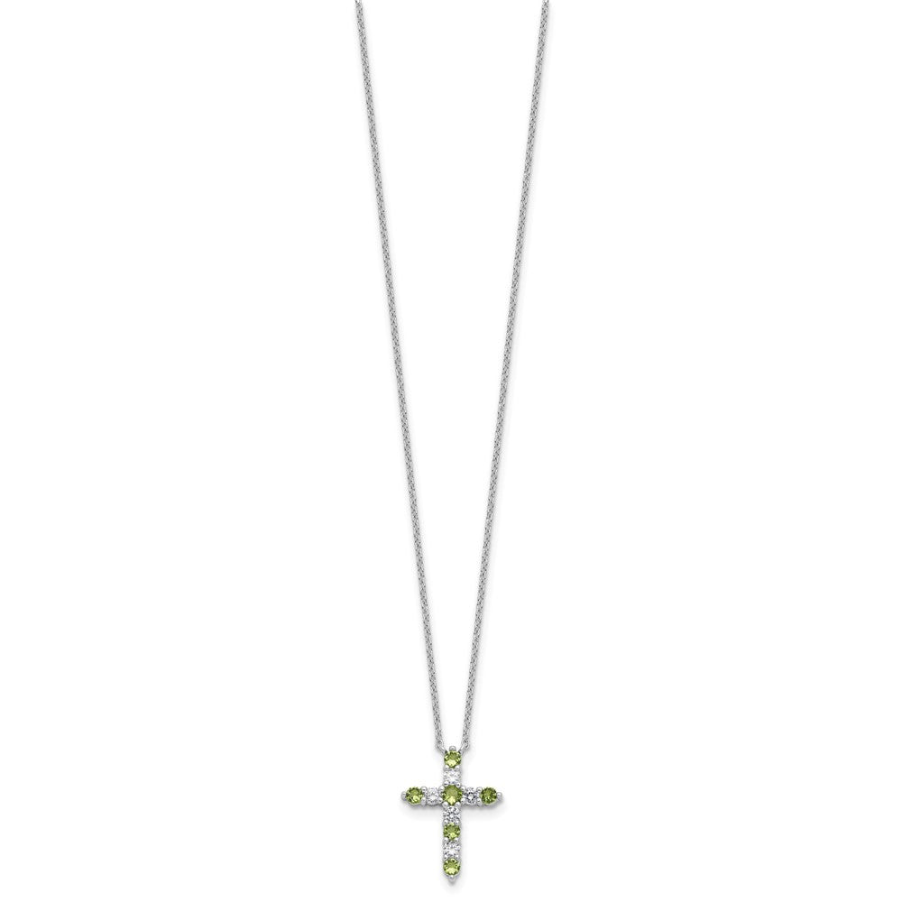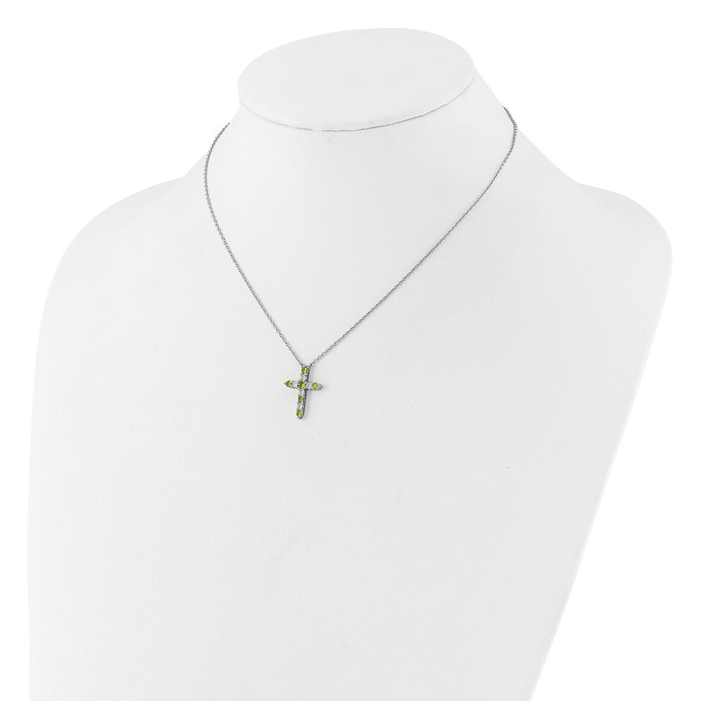 SS RH-plated Green CZ August Birthstone Cross w/2in ext Necklace