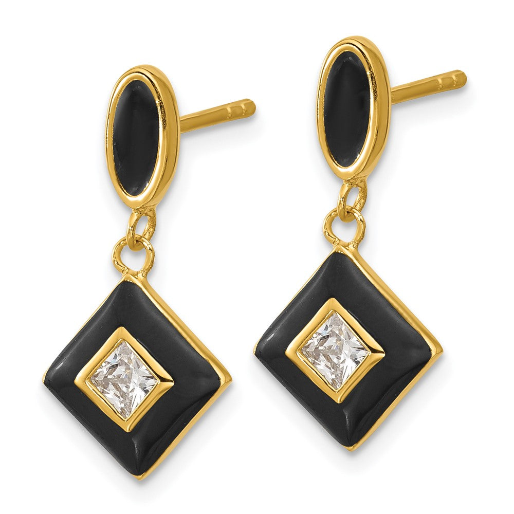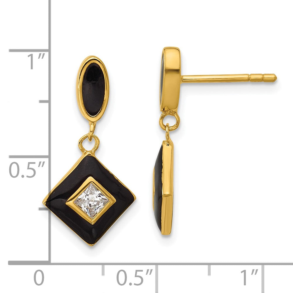 Sterling Silver Gold-plated CZ and Black Enameled Dangle Post Earrings