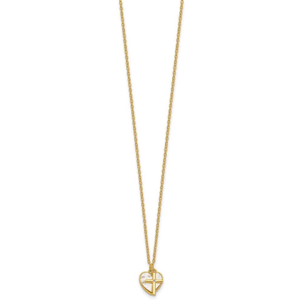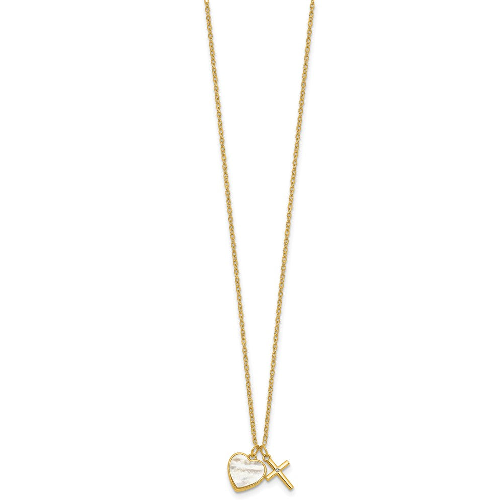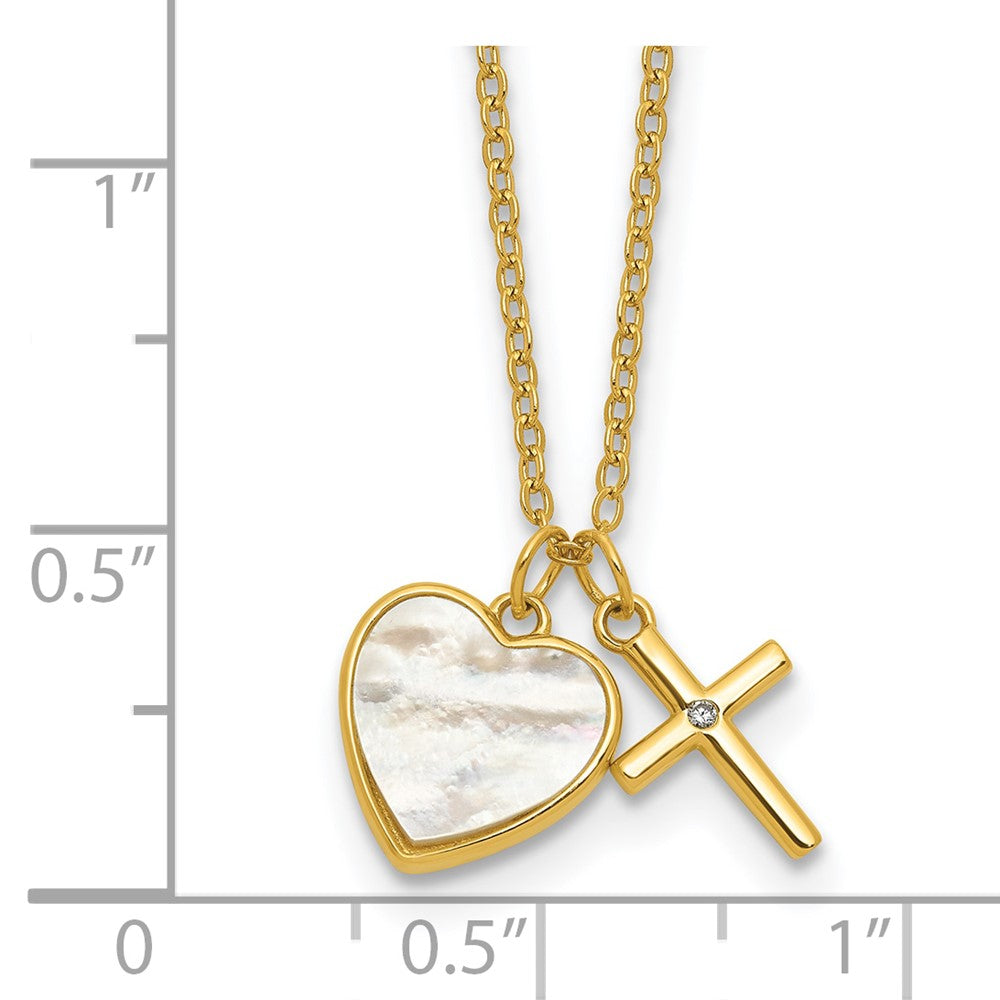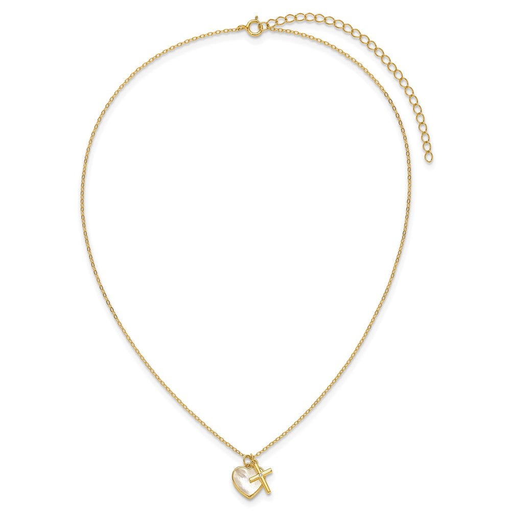 Sterling Silver Gold-tone Polished Mother of Pearl Heart and CZ Cross with Extension Children's Necklace