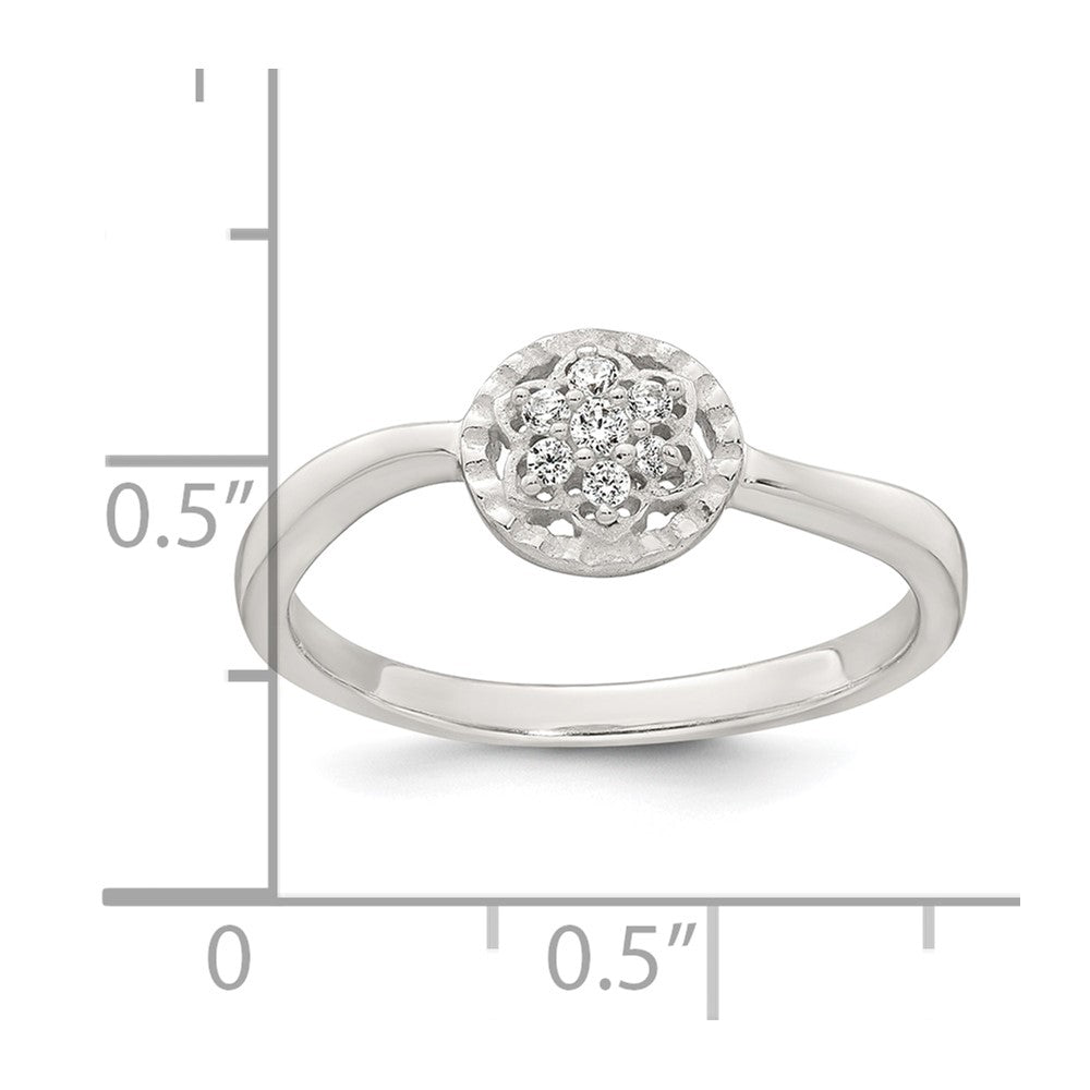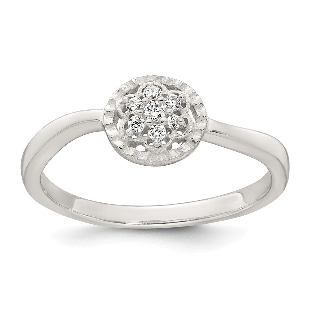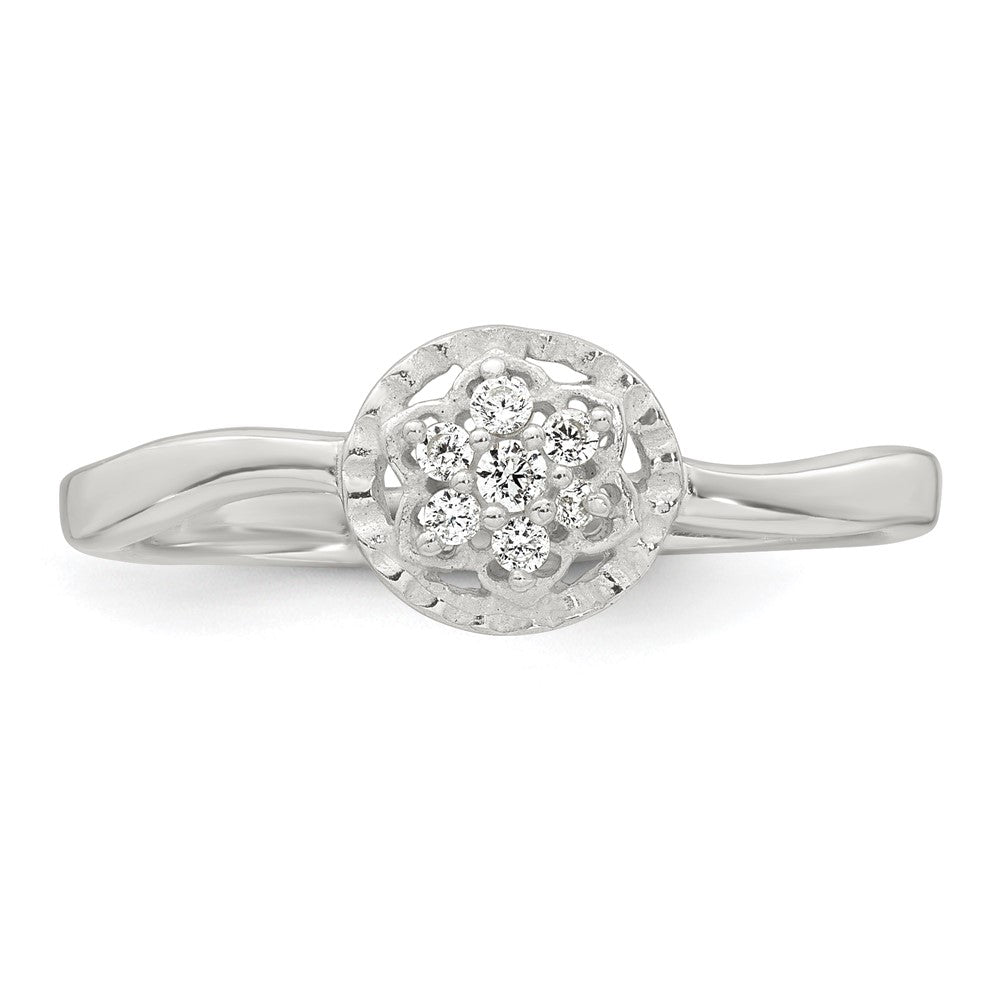 Sterling Silver Polished and Grooved White CZ Flower with Wavy Shank Size 8 Ring