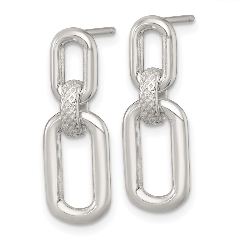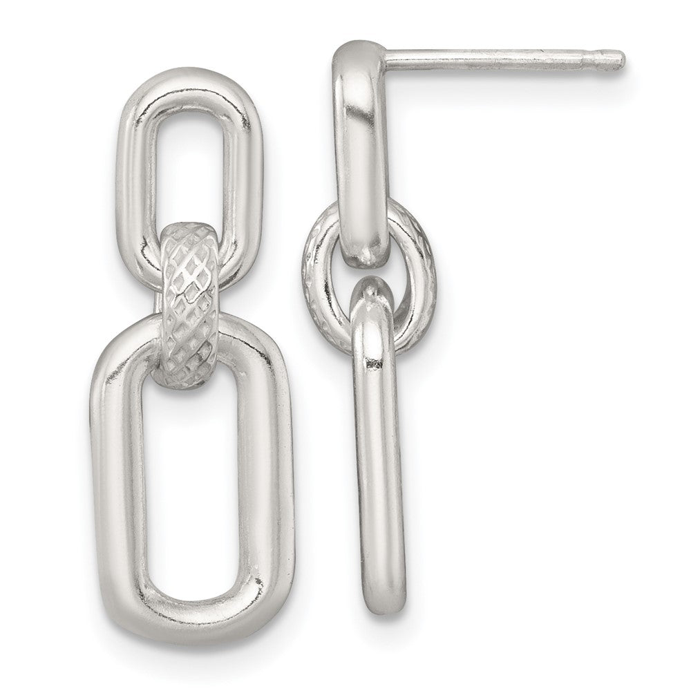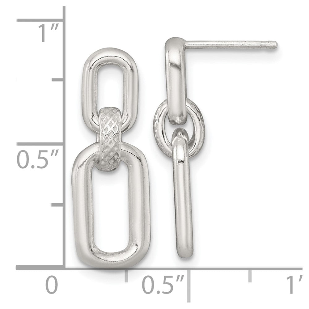 Sterling Silver Polished and Textured Fancy Rectangular Link Dangle Post Earrings