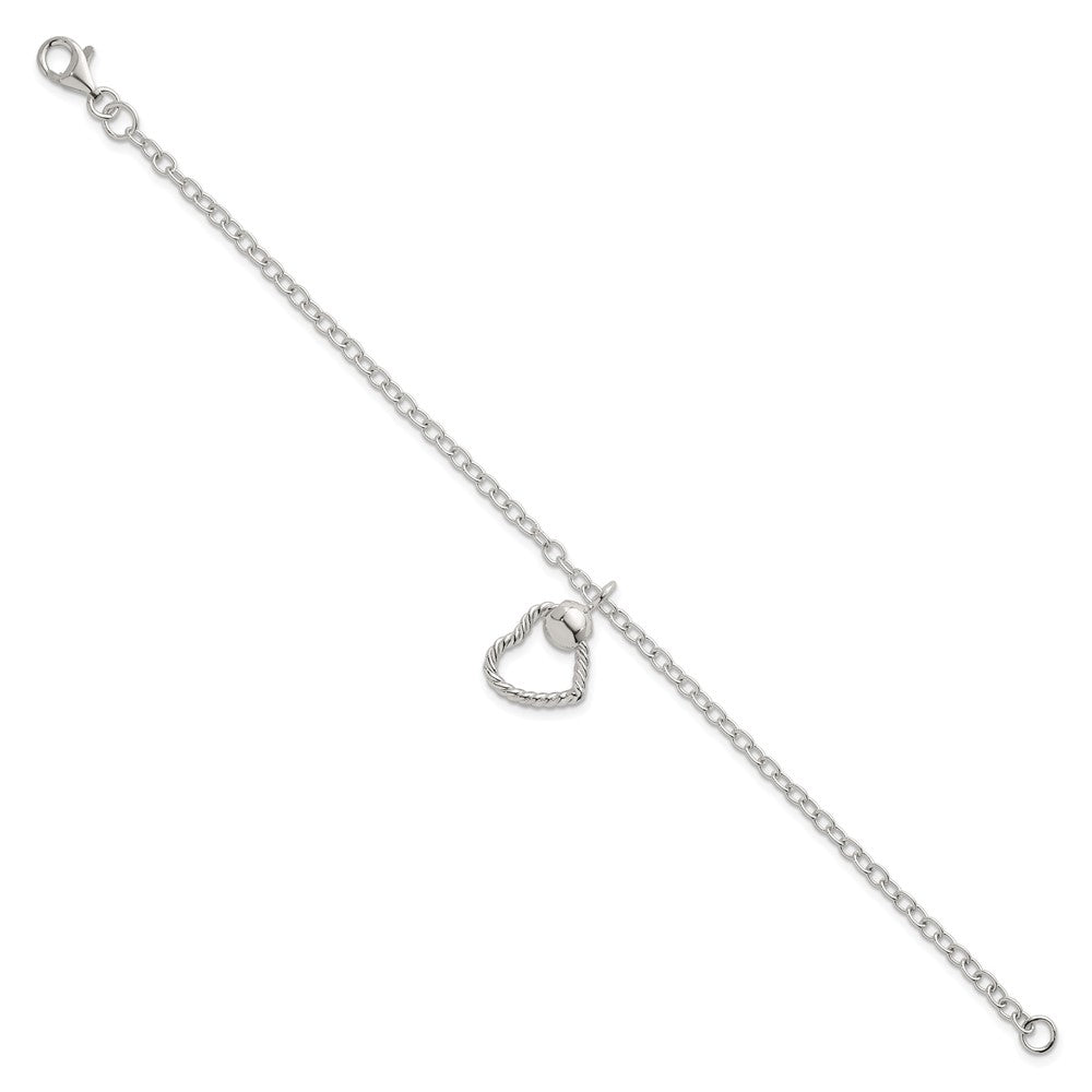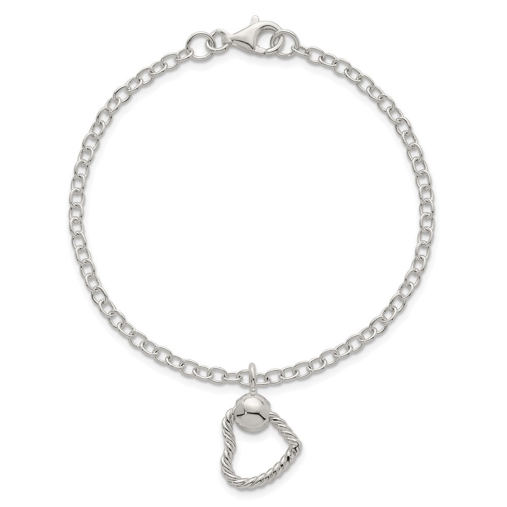Sterling Silver Polished and Twisted Heart Dangle 7. Cable Chain Bracelet