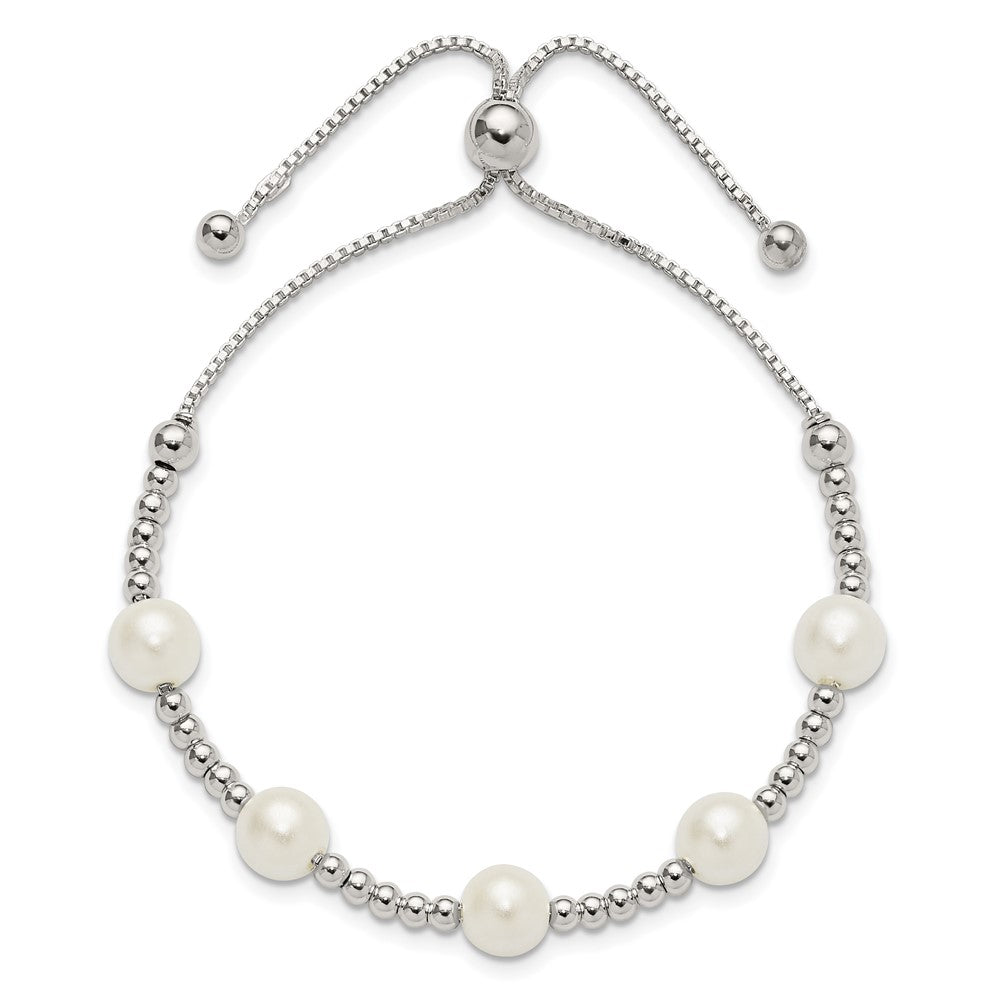 Sterling Silver Polished Beaded and Synthetic Pearl Adjustable Bracelet