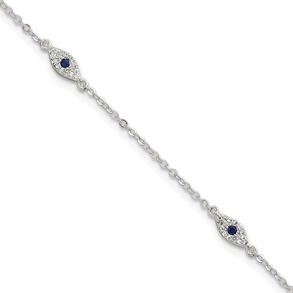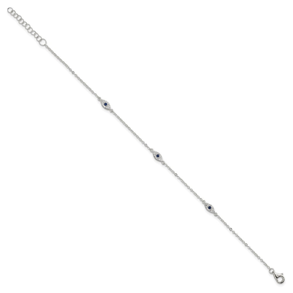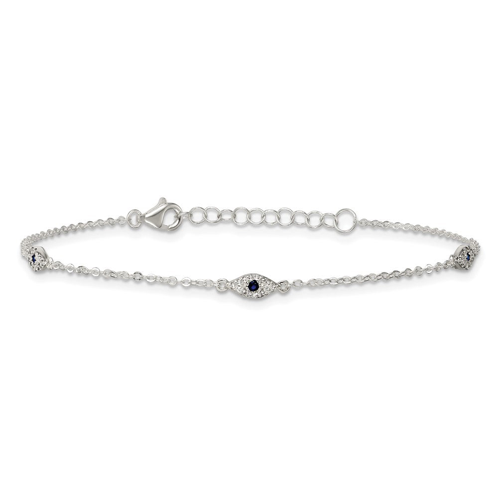 Sterling Silver Polished Blue and White CZ Evil Eye with Extension Bracelet