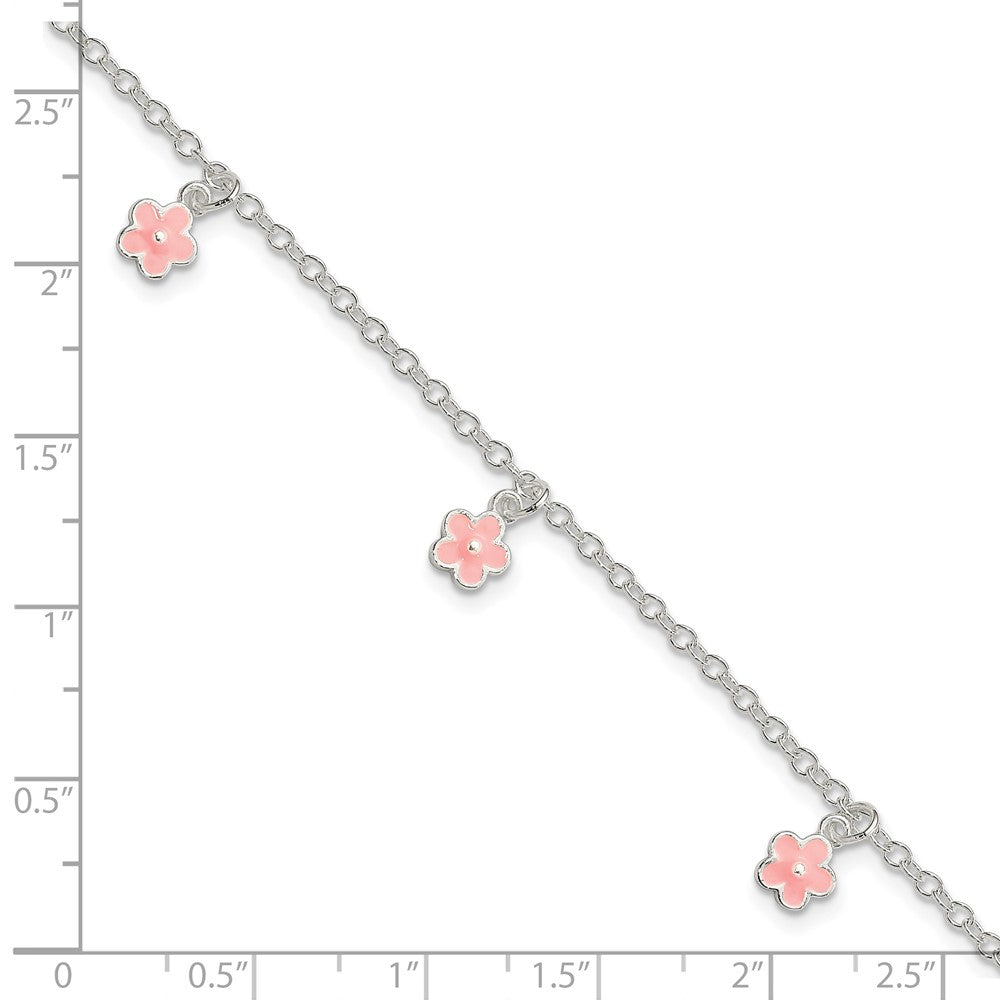 Sterling Silver Polished Pink Enamel Flowers w/1.5in Ext Children's Bracele