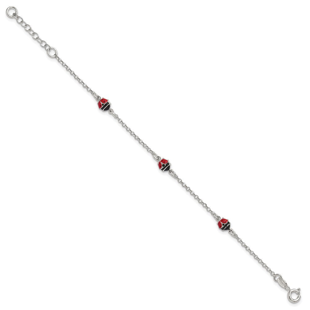 Sterling Silver Polished Red and Black Enameled Ladybugs with extension Childrens Bracelet