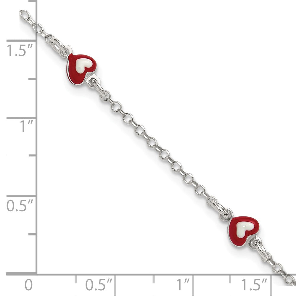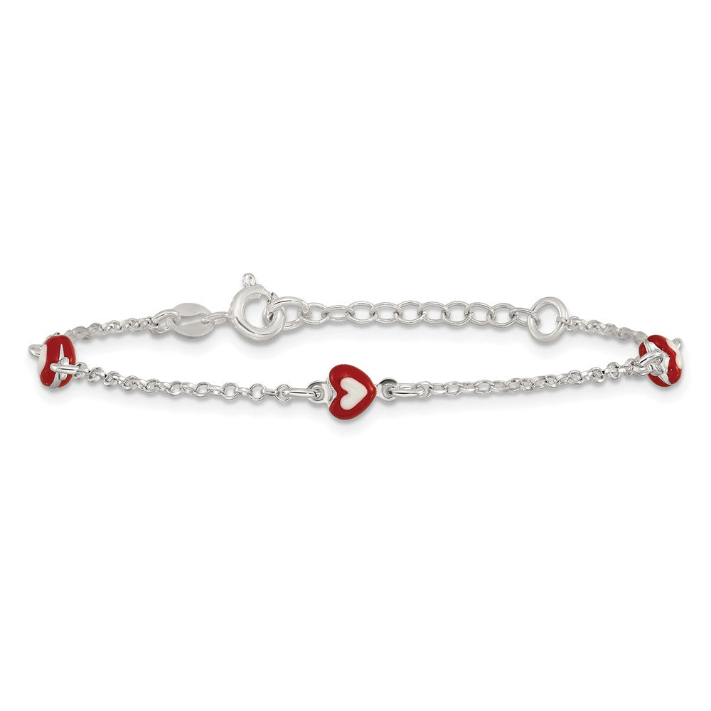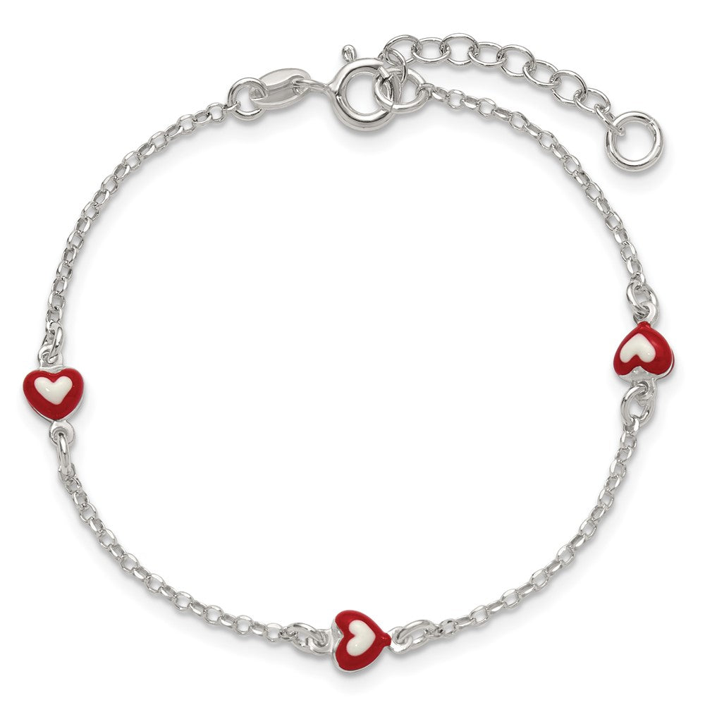 Sterling Silver Polished Red and White Enameled Hearts with extension Childrens Bracelet