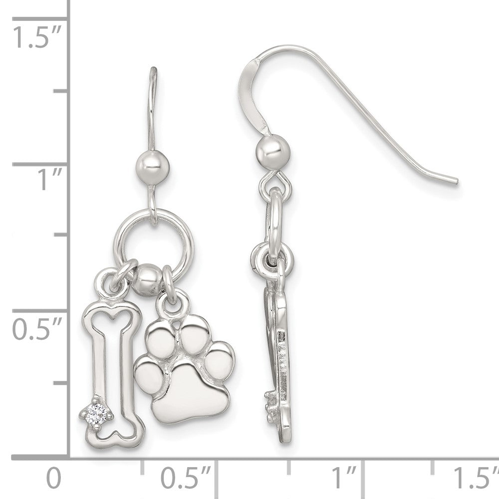 Sterling Silver Polished White CZ Bone and Paw Dangle Shepherd Hook Earrings