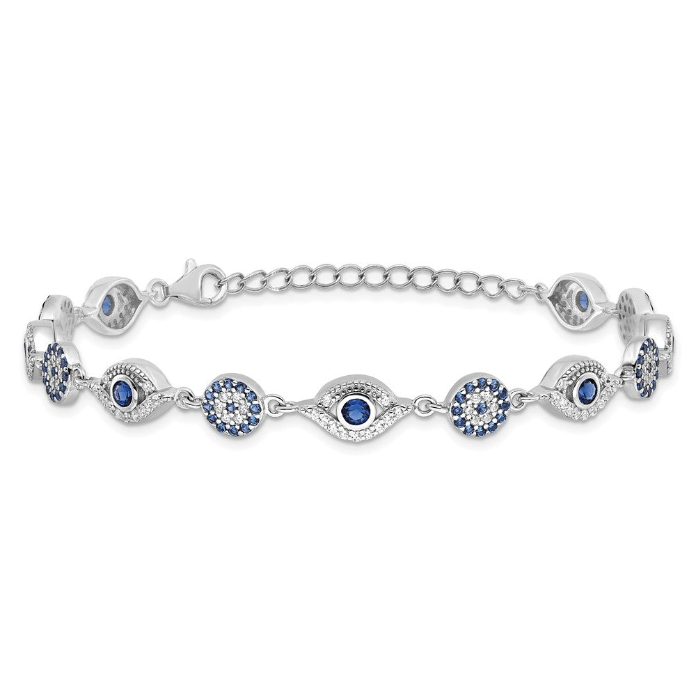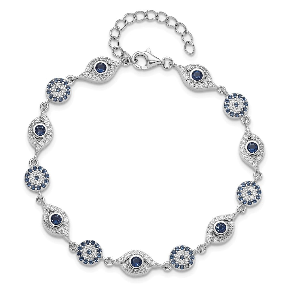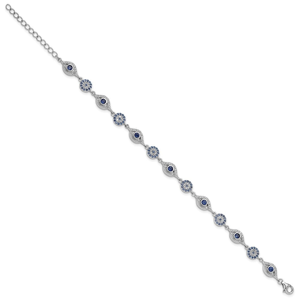 Sterling Silver RH-plated Blue White CZ Evil Eye 7.25in w/1.5in ext. Bracel