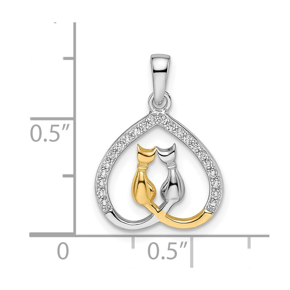 Sterling Silver RH-plated & Gold-plated CZ Heart w/Two Cats Pendant
