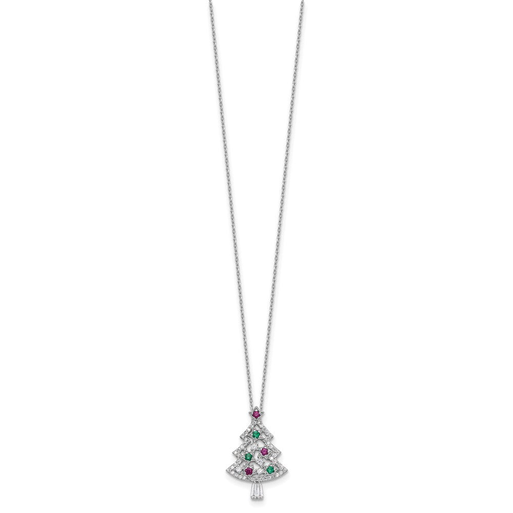 Sterling Silver RH-plated Multi Color CZ Christmas Tree w/2in ext Necklace