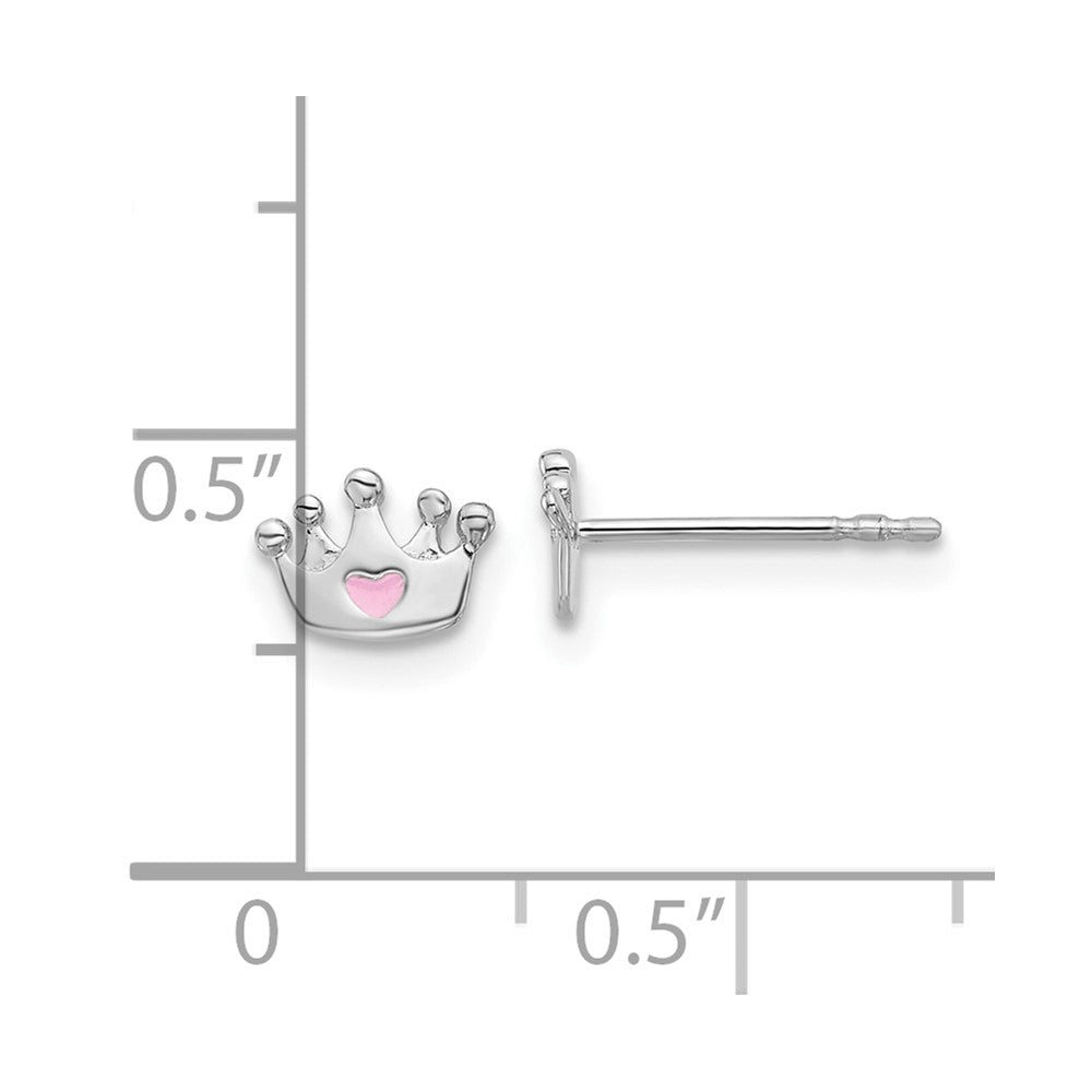 Sterling Silver RH-plated Pink Enamel Heart Crown Children's Post Earrings