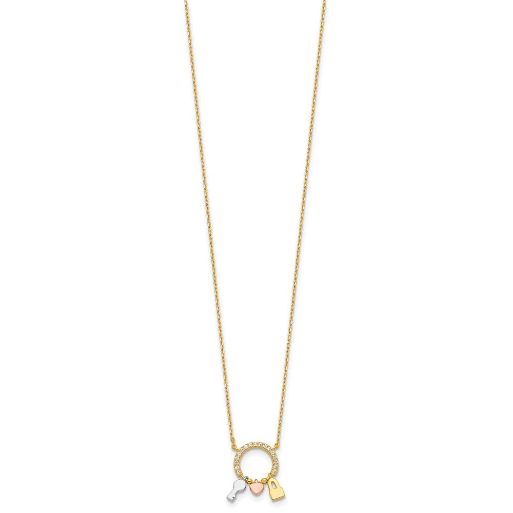 Sterling Silver Rhod-plated Gold/Rose-tone CZ Key/Lock/Heart w/2In Ext Neck