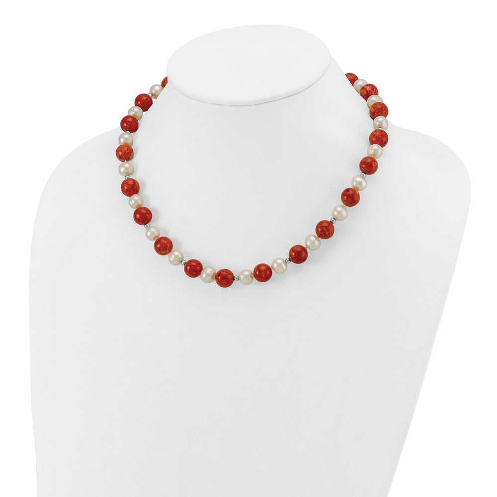 Sterling Silver Rhod-pltd FWC Pearl / Stabilized Red Coral Necklace