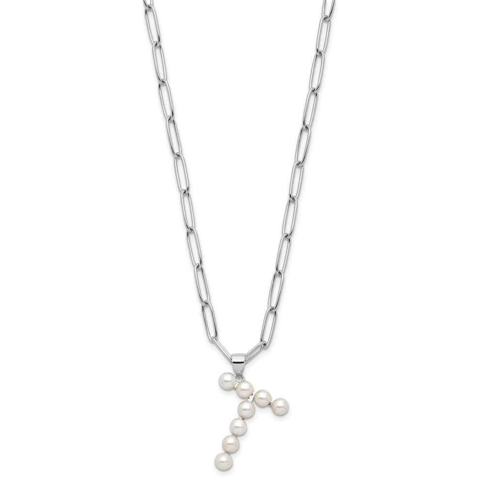 Sterling Silver Rhodium-plated 3- White Button Freshwater Cultured Pearl LETTER T Necklace