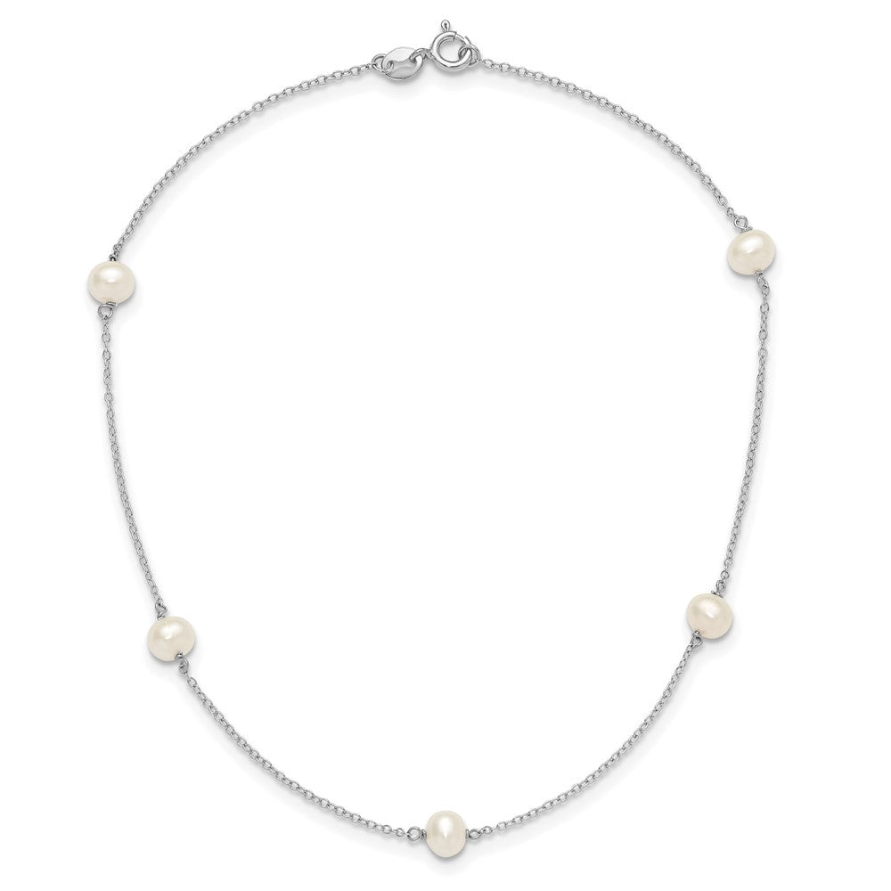 Sterling Silver Rhodium-plated 5-5.5mm White Semi-Round Freshwater Cultured Pearl 5-Station Children's 12 inch Necklace