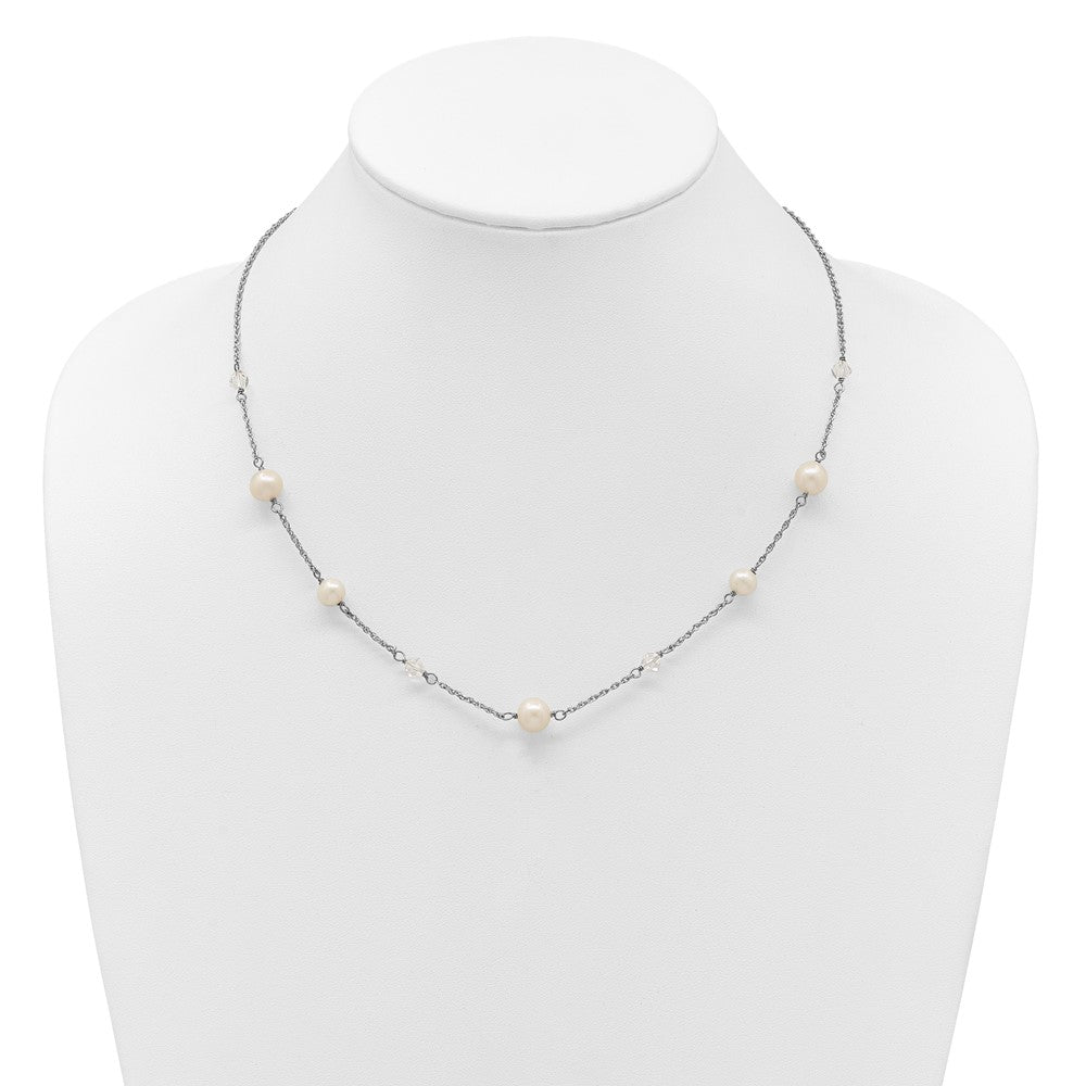 Sterling Silver Rhodium-plated 6- White Near-Round Freshwater Cultured Pearl and Glass 5-Station 17. with 2. Extension Necklace