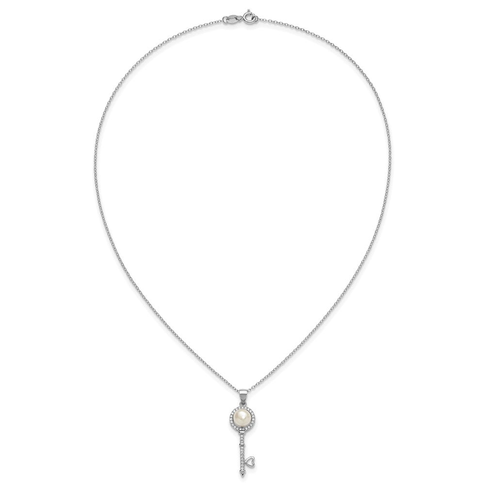 Sterling Silver Rhodium-plated 7- Button White Freshwater Cultured Pearl and CZ Key Necklace