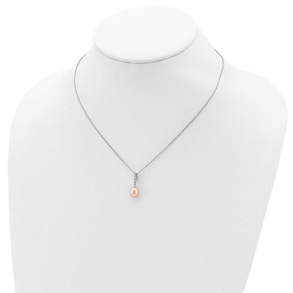 Sterling Silver Rhodium-plated 7- Pink Teardrop Freshwater Cultured Pearl and CZ Necklace