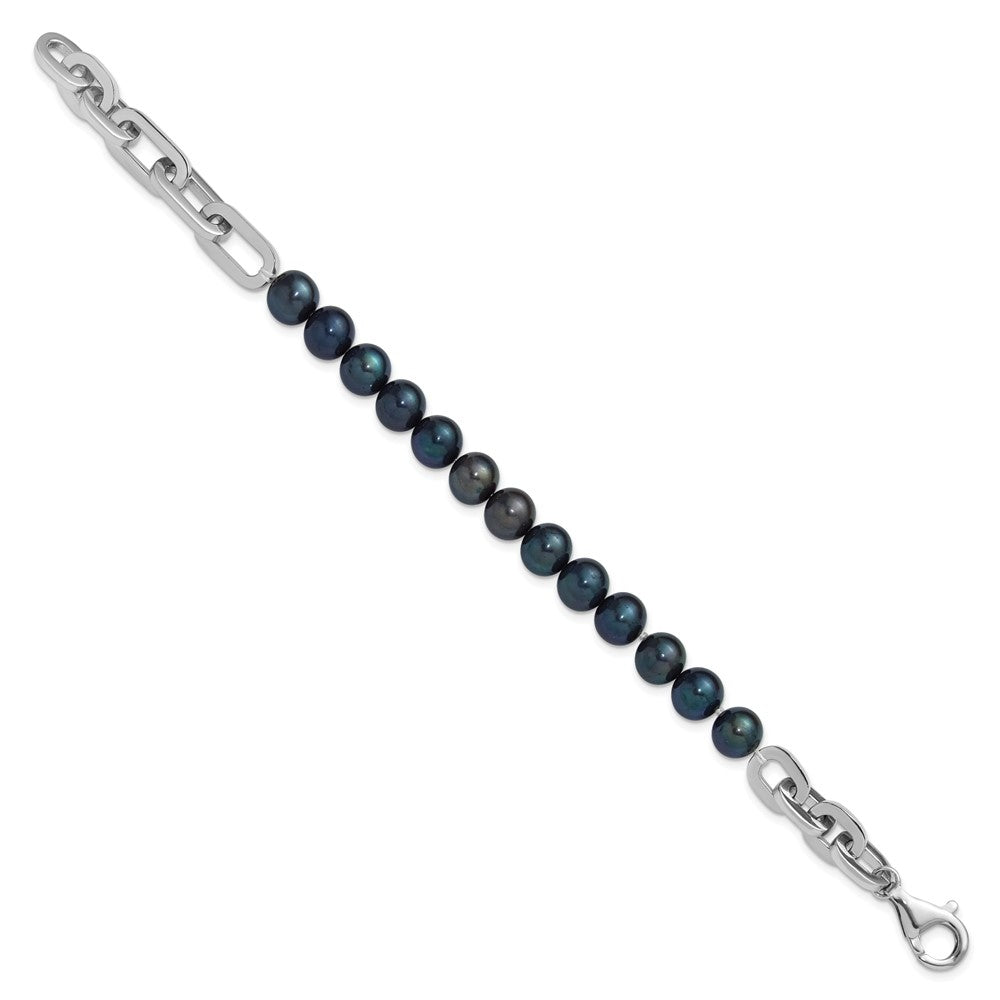 Sterling Silver Rhodium-plated 7- Round Black Freshwater Cultured Pearl and Link Bracelet