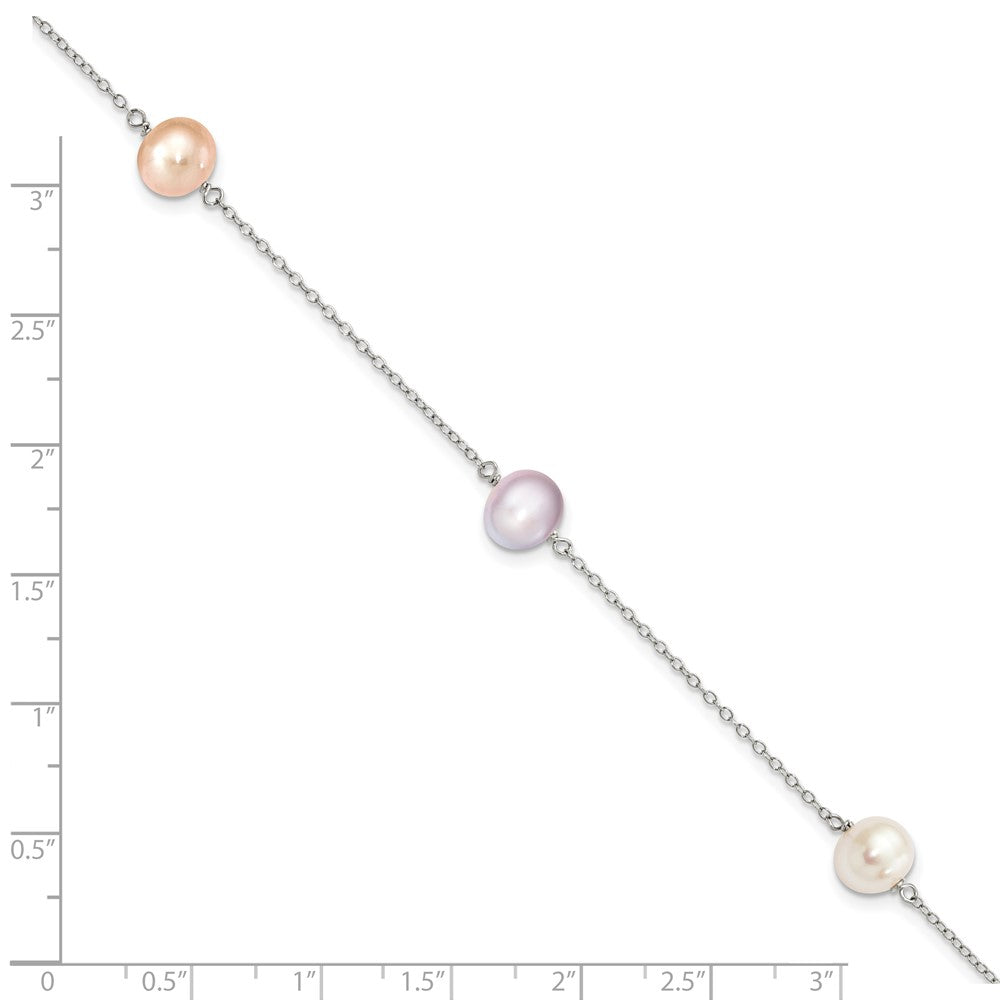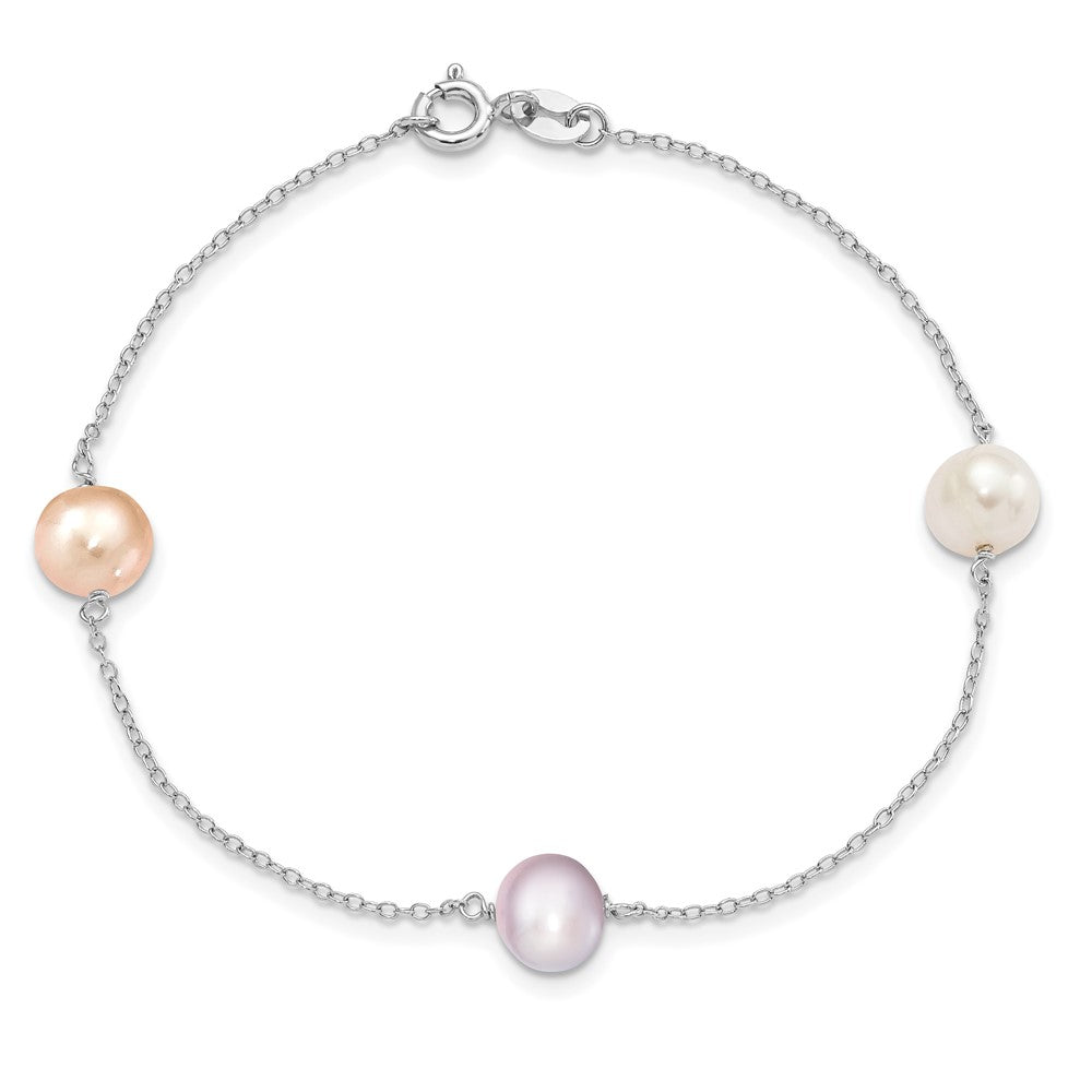 Sterling Silver Rhodium-plated 7-8mm White, Pink and Purple Semi-Round Freshwater Cultured Pearl 3-Station 7.5 inch Bracelet