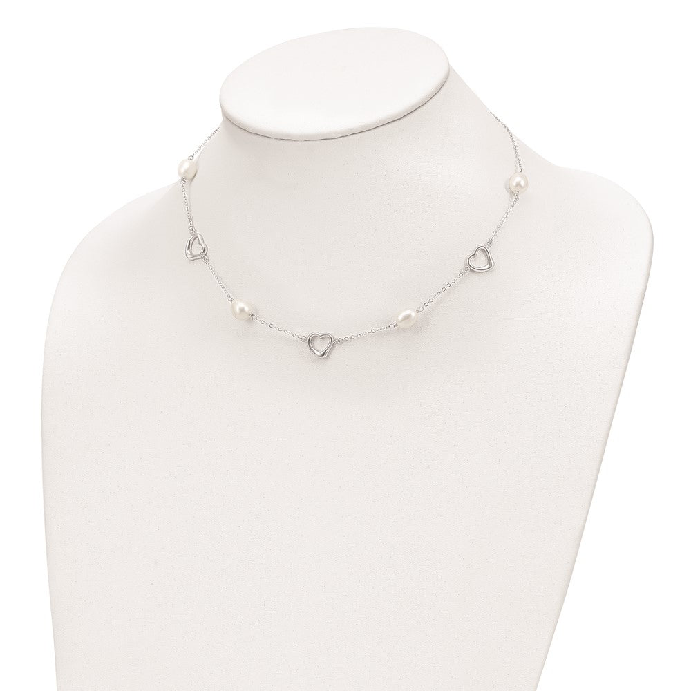 Sterling Silver Rhodium-plated 7- White Teardrop Freshwater Cultured Pearl and Hearts with Extension Necklace