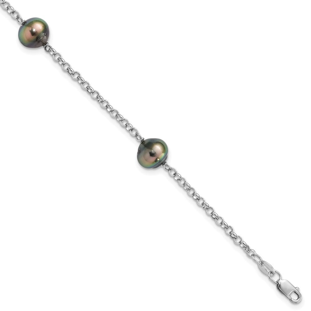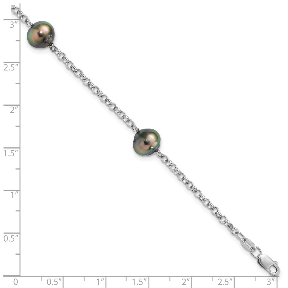 Sterling Silver Rhodium-plated 8-9mm Black Baroque Tahitian Saltwater Cultured Pearl 3-Station 7.5 inch Bracelet