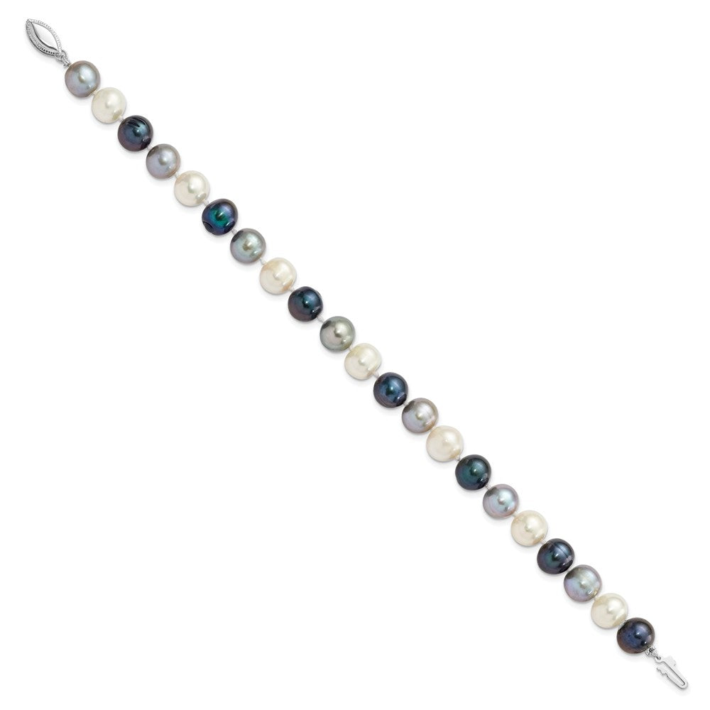 Sterling Silver Rhodium-plated 8-9mm Black, Green and White Semi-Round Freshwater Cultured Pearl 7.5 inch Bracelet