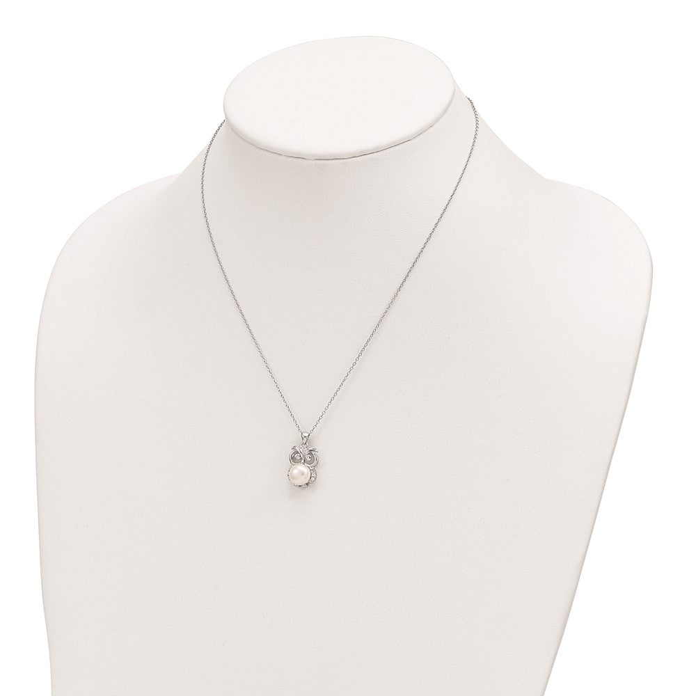 Sterling Silver Rhodium-plated 8- White Button Freshwater Cultured Pearl and CZ Owl Necklace