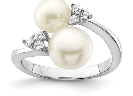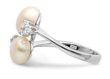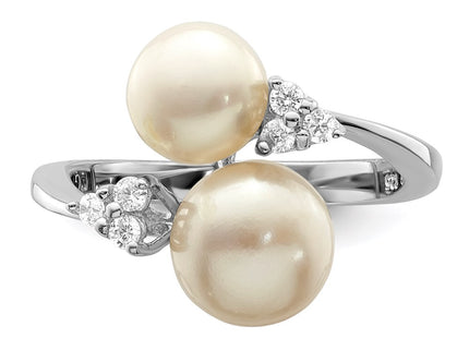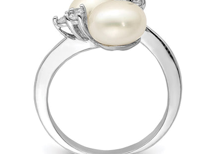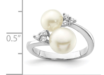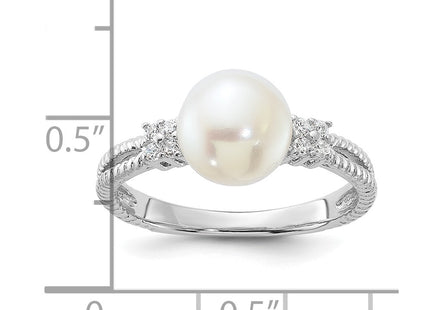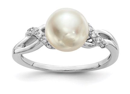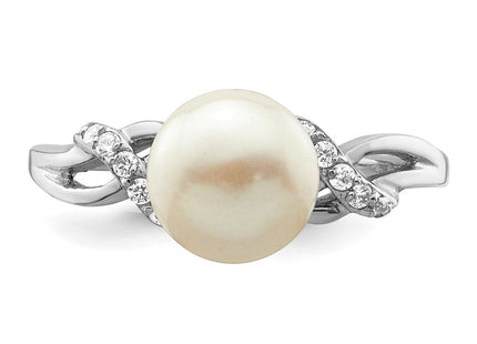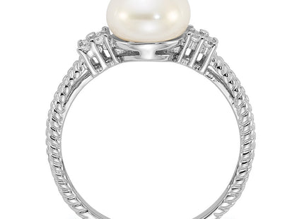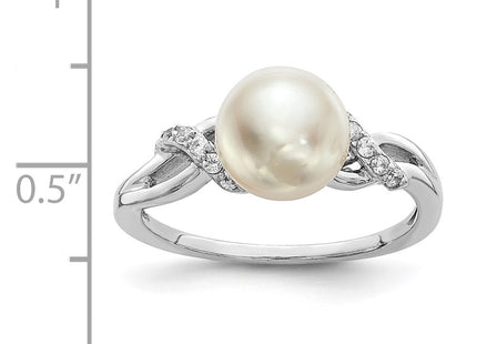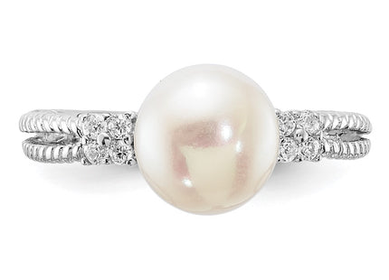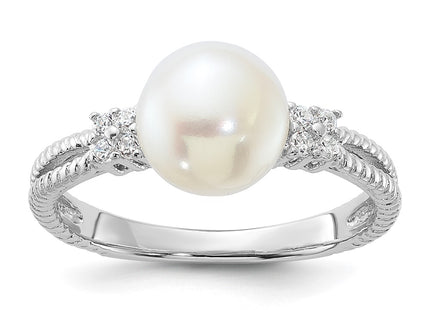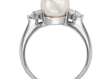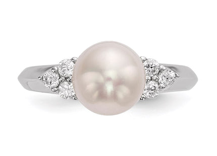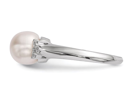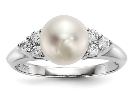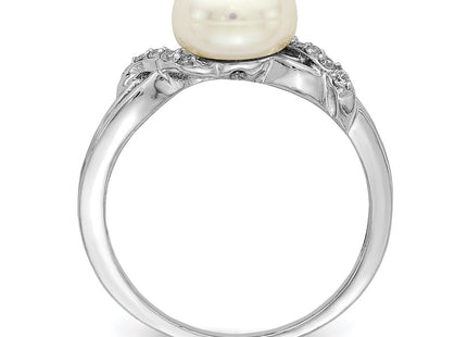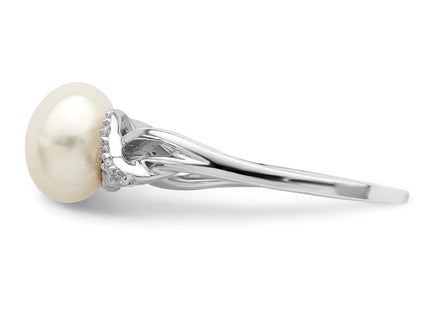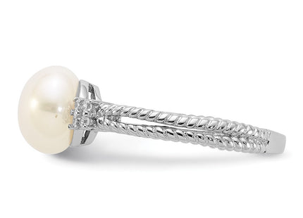 Sterling Silver Rhodium-plated 8- White Button Freshwater Cultured Pearl and CZ Ring
