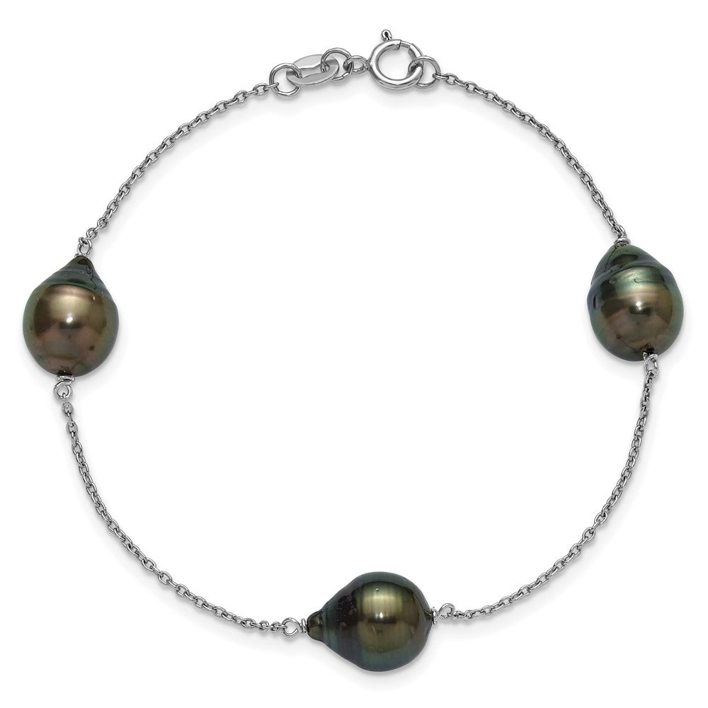 Sterling Silver Rhodium-plated 9- Baroque Black Tahitian Saltwater Cultured Pearl 3-Station 7. Bracelet
