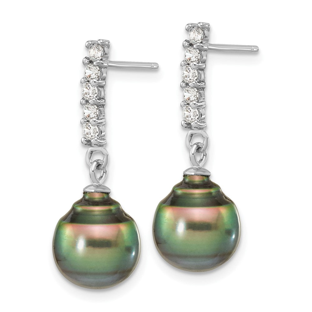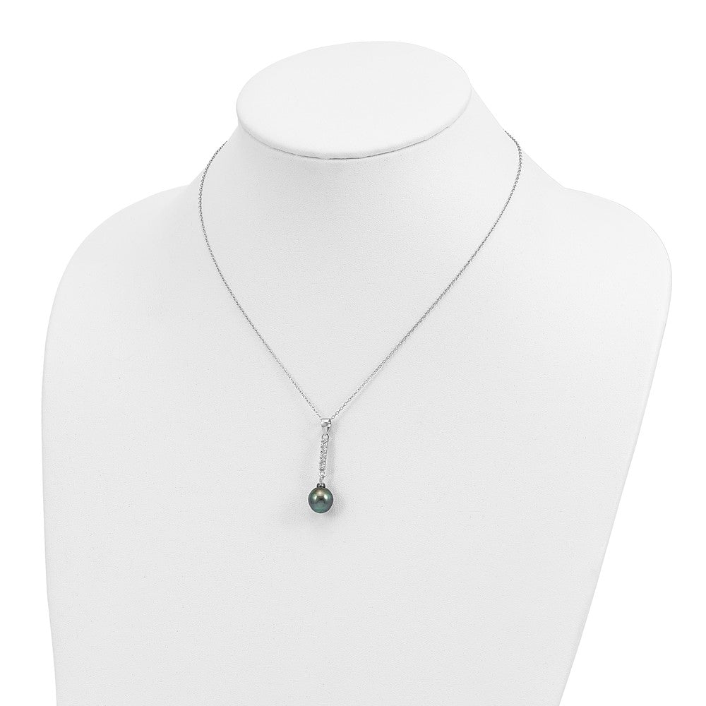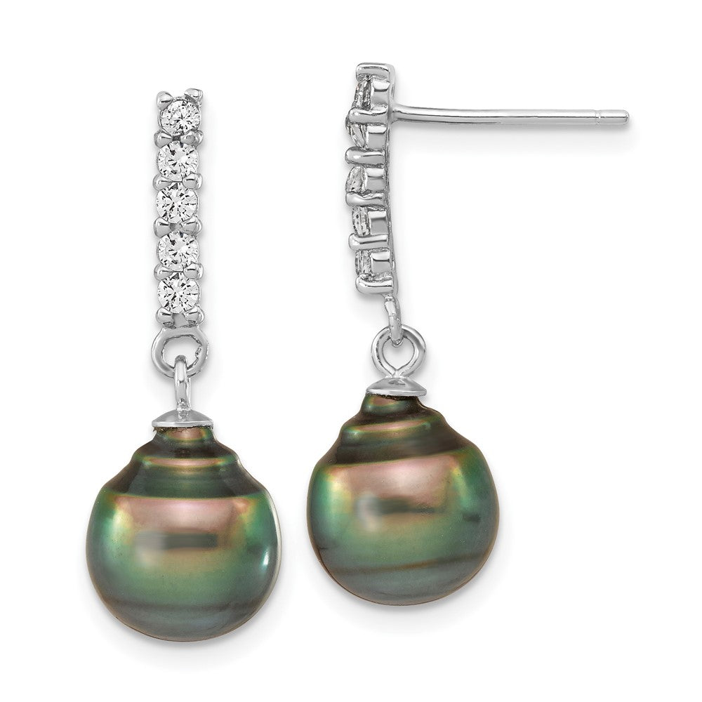 Sterling Silver Rhodium-plated 9- Black Teardrop Tahitian Saltwater Pearl and CZ Necklace and Post Dangle Earrings Set