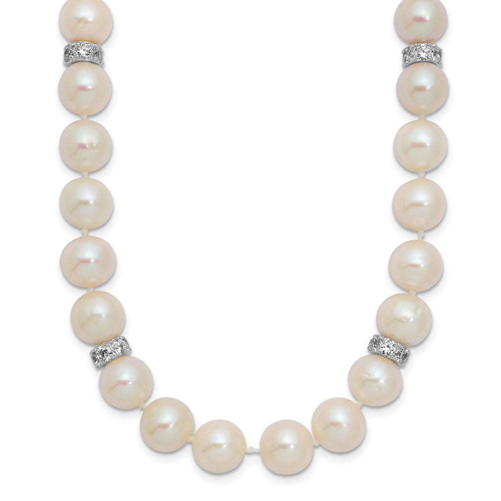 Sterling Silver Rhodium-plated 9-10mm White Near-Round Freshwater Cultured Pearl and CZ 18 inch Necklace