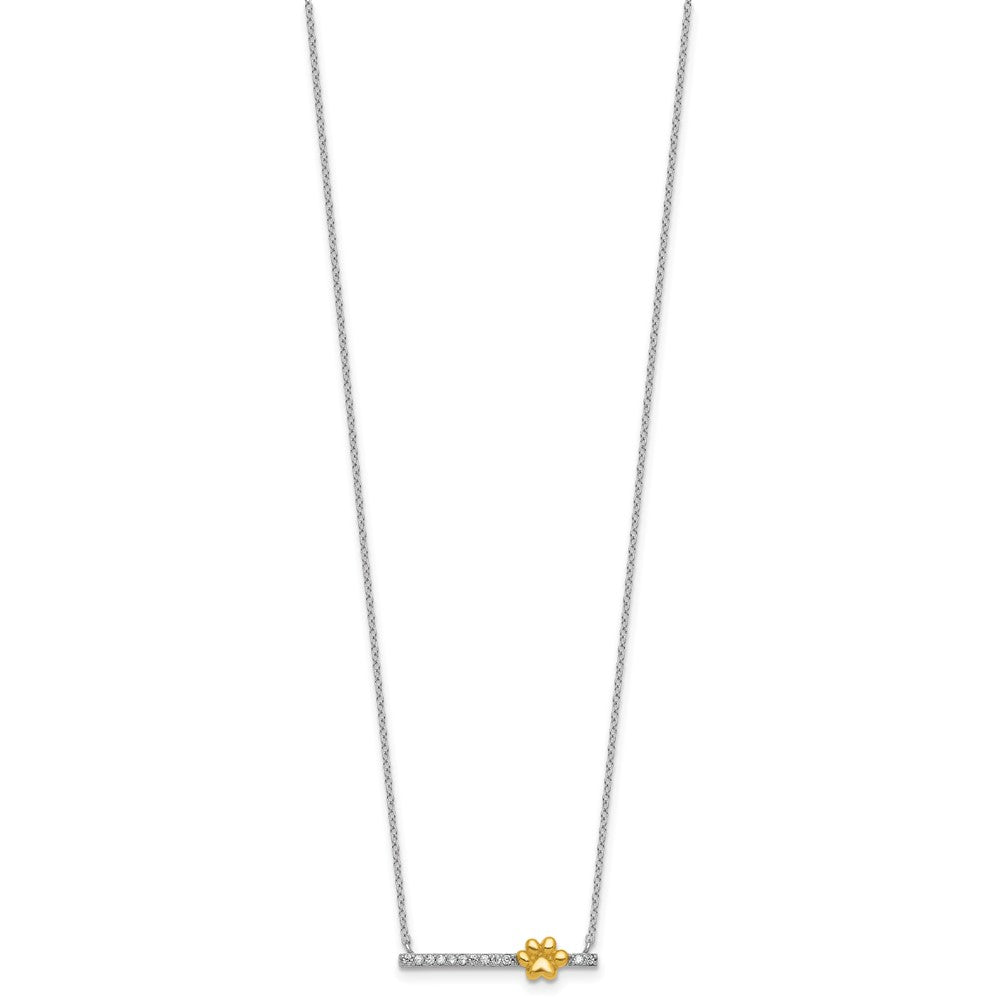 Sterling Silver Rhodium-plated and Gold-tone Polished CZ Pawprint Bar with Extension Necklace