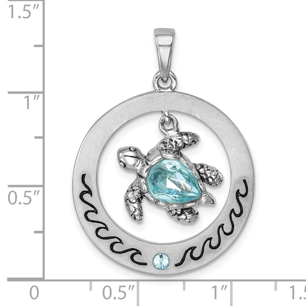 Sterling Silver Rhodium-plated Antiqued Round Moveable Crystal Turtle Pendant